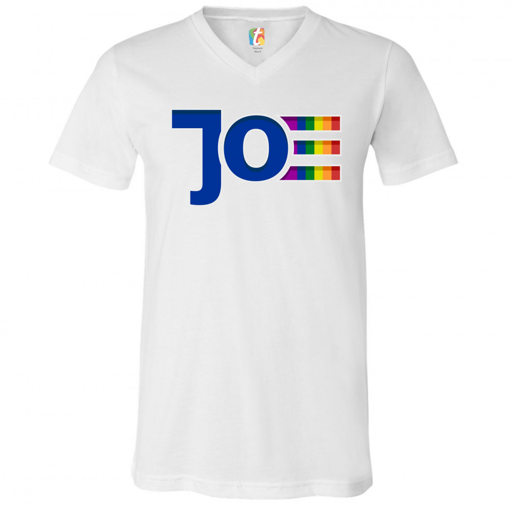 A political print featuring the name of the democratic presidential candidate "Joe". The letter "e" is painted with the colors of the lgbt rainbow. It is a great choice to wear to show your support for the democratic presidential nominee and his vice pres