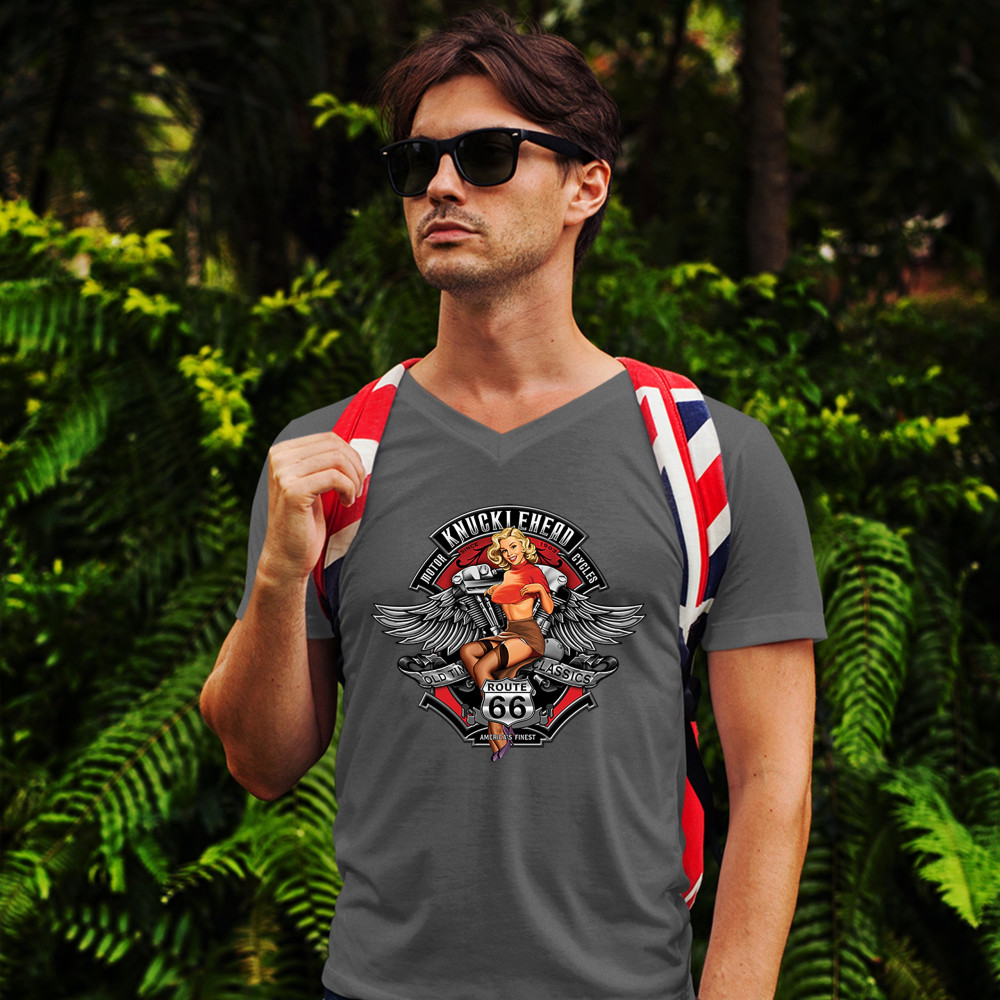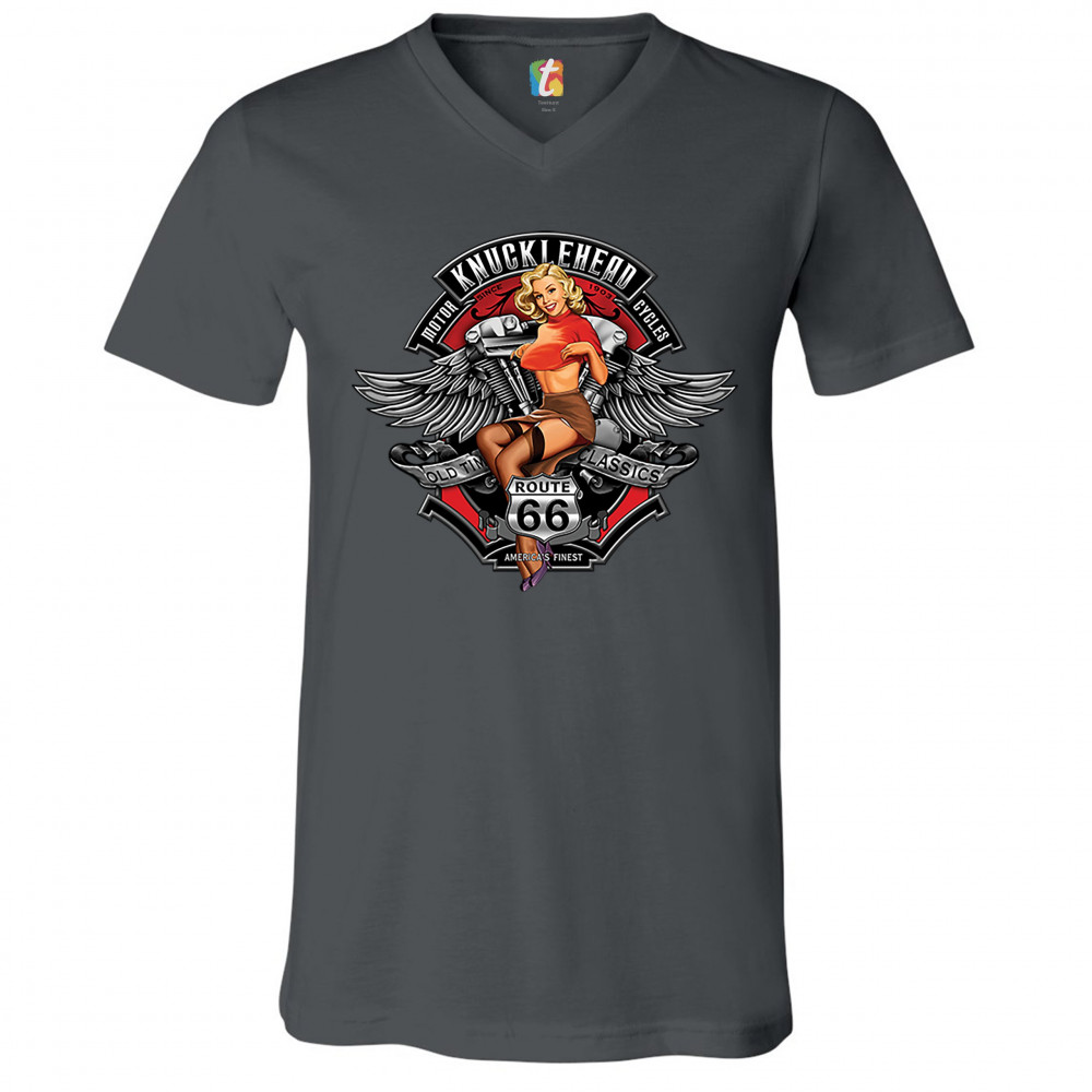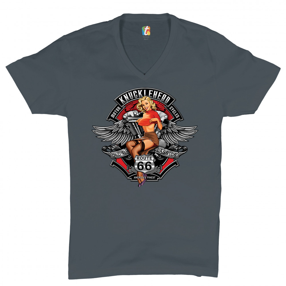 KNUCKLEHEAD MOTORCYCLES v-neck t-shirt old time classics pin-up girl biker tee charcoal