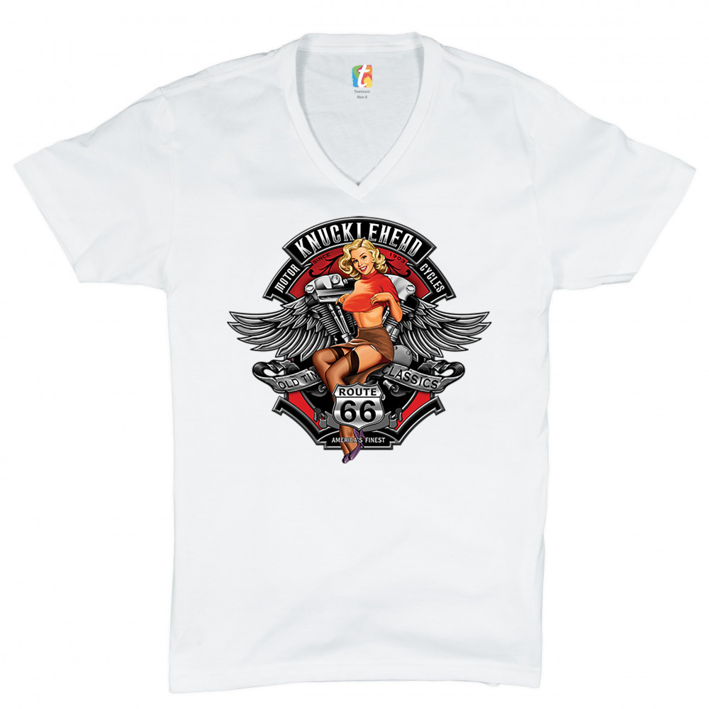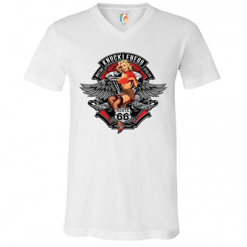 A print featuring a sexy pin-up girl. In front of her legs there is a "Route 66" sign. In the background there is a motorcycle engine and wings behind it. The print says: "Knucklehead motorcycles since 1903. Old time classics. America's finest". A great c