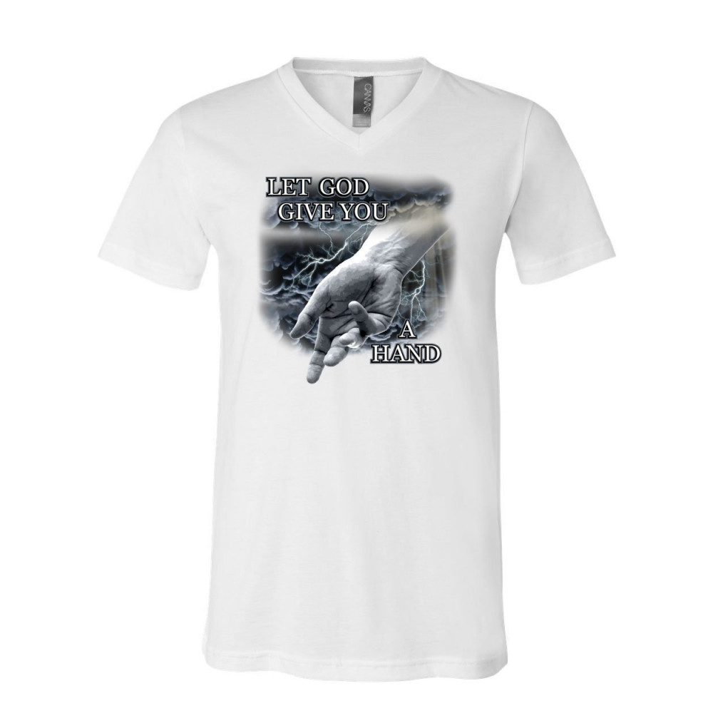 LET GOD GIVE YOU A HAND v-neck t-shirt religious catholic jesus bible tee white