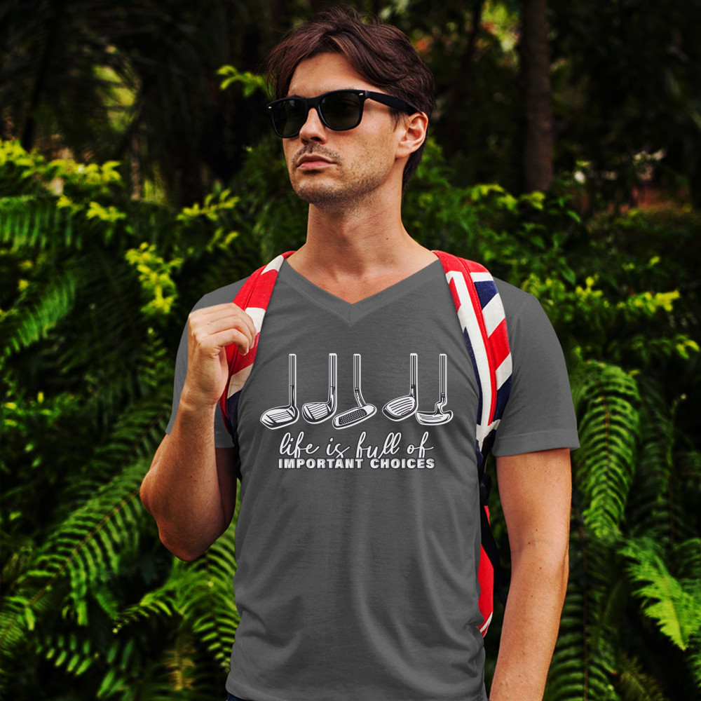LIFE IS FULL OF IMPORTANT CHOICES v-neck t-shirt funny golf clubs golfing tee charcoal