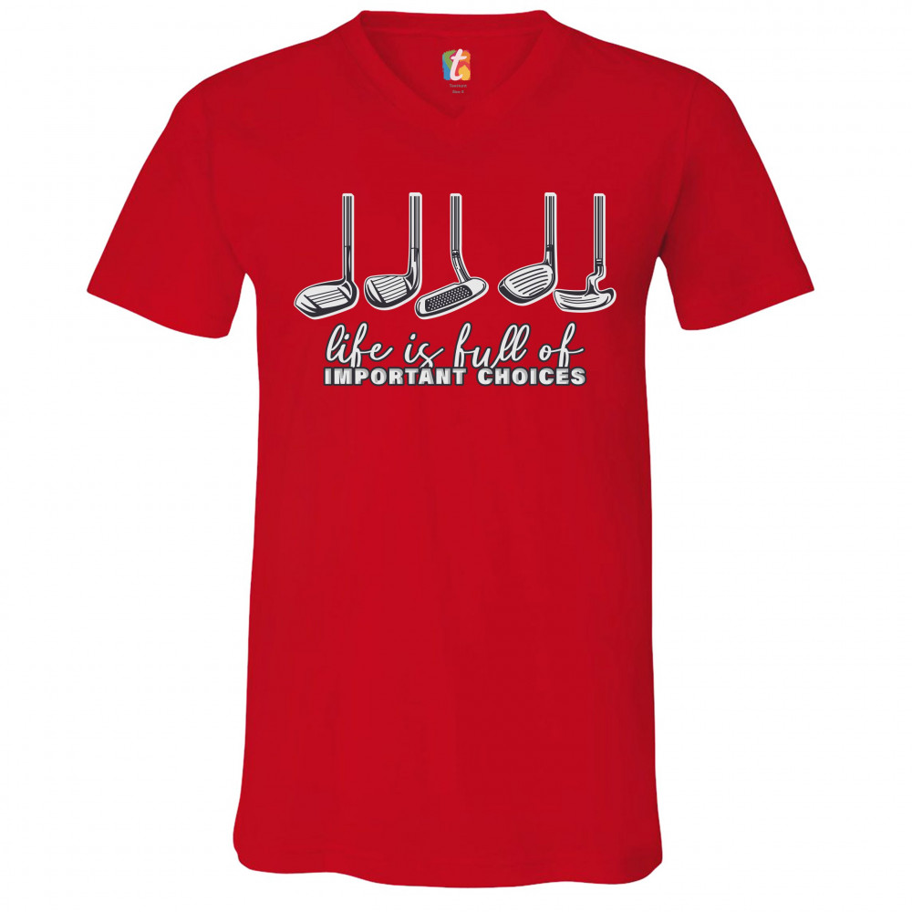 LIFE IS FULL OF IMPORTANT CHOICES v-neck t-shirt funny golf clubs golfing tee red