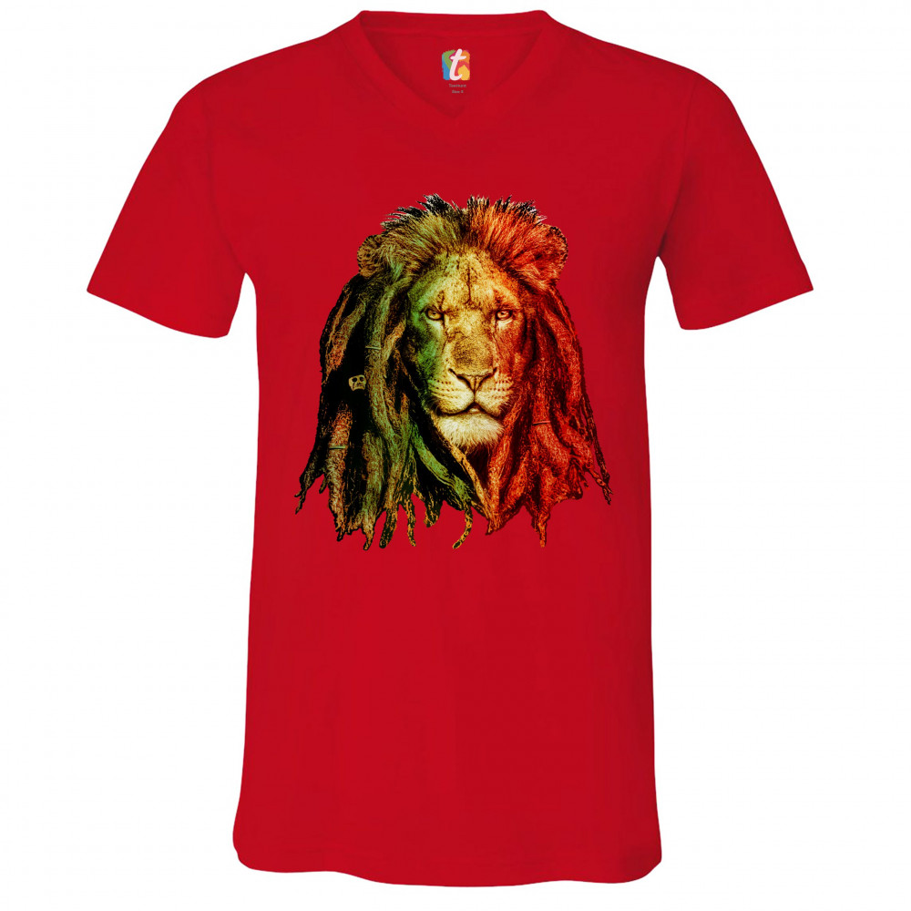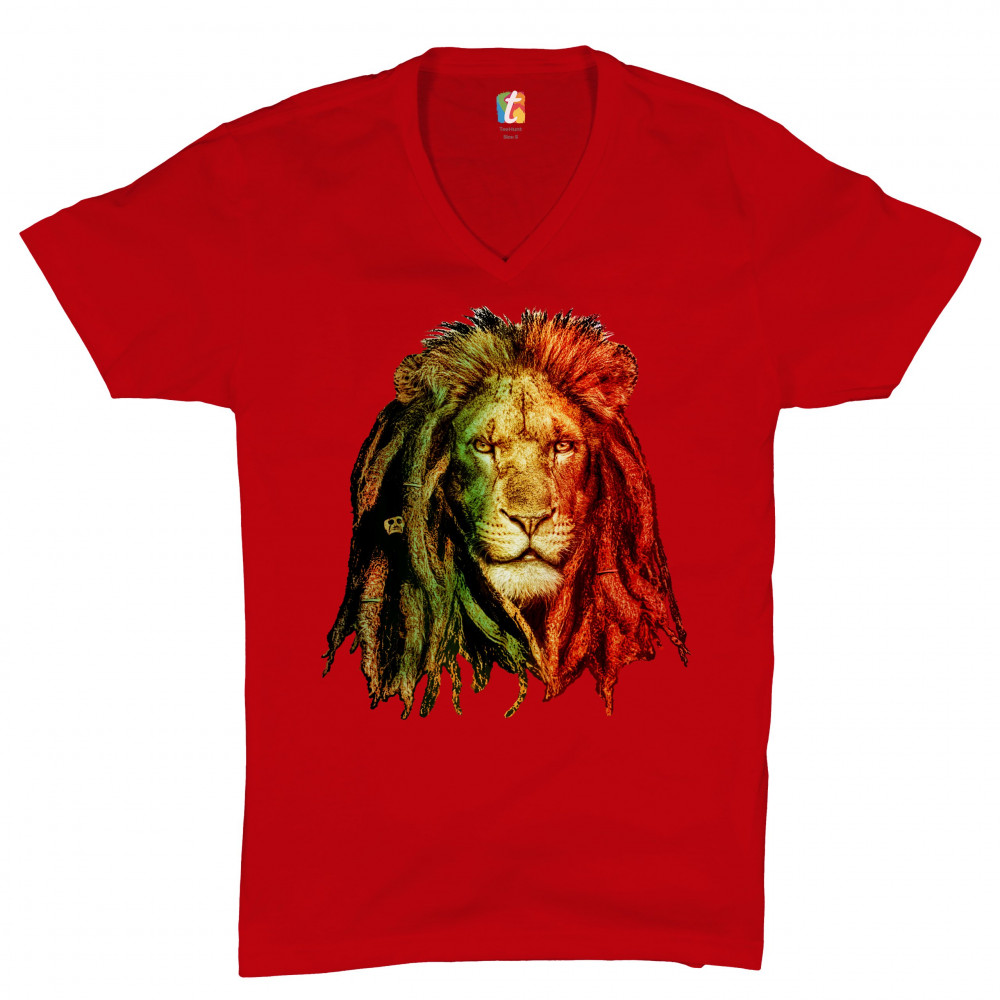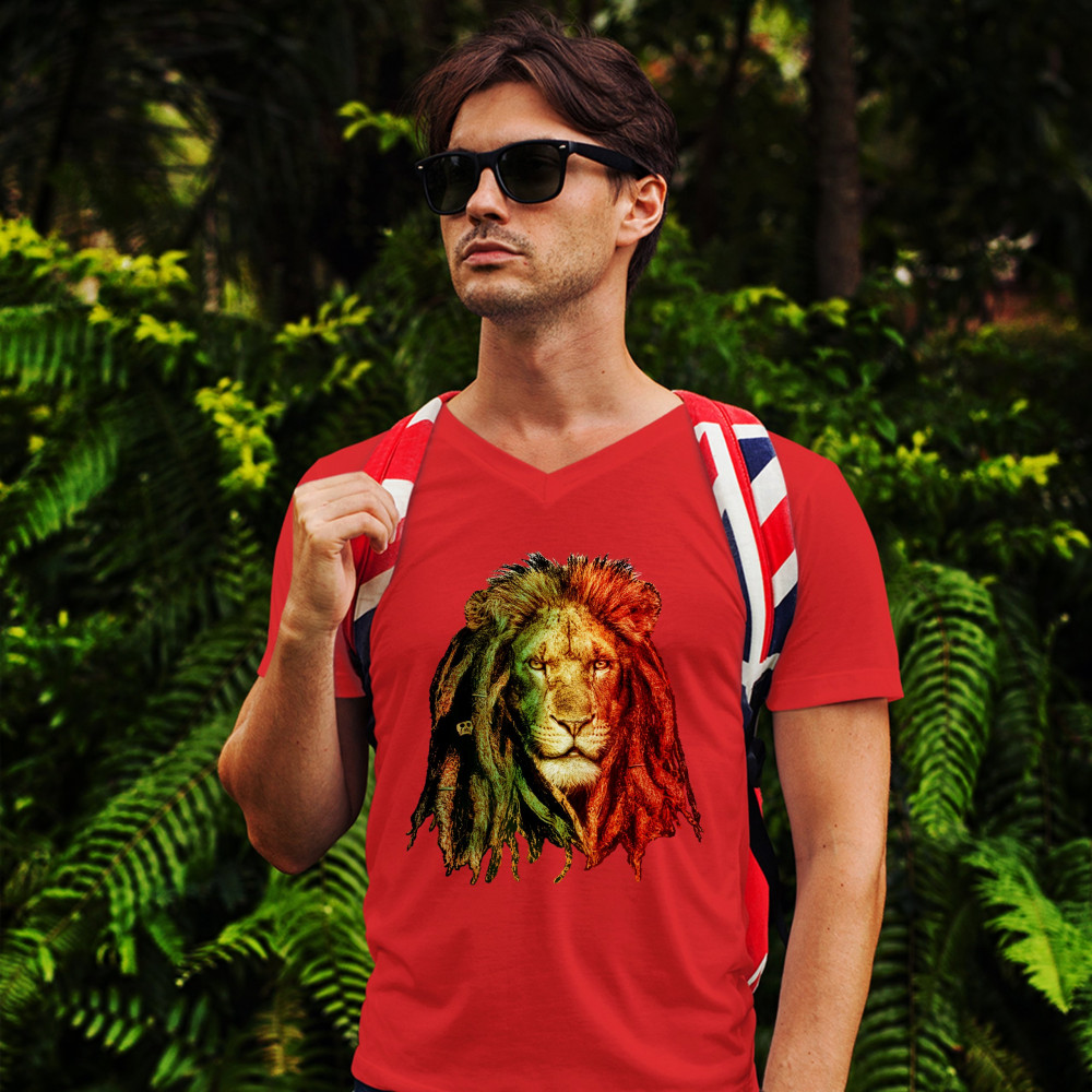 LION WITH DREADLOCKS v-neck t-shirt rastafari jah jamaica marijuana 420 tee red