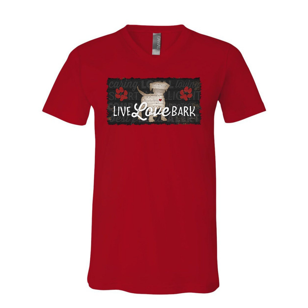 LIVE LOVE BARK v-neck t-shirt cute dog puppy doggie paw wiggle pet woof tee red