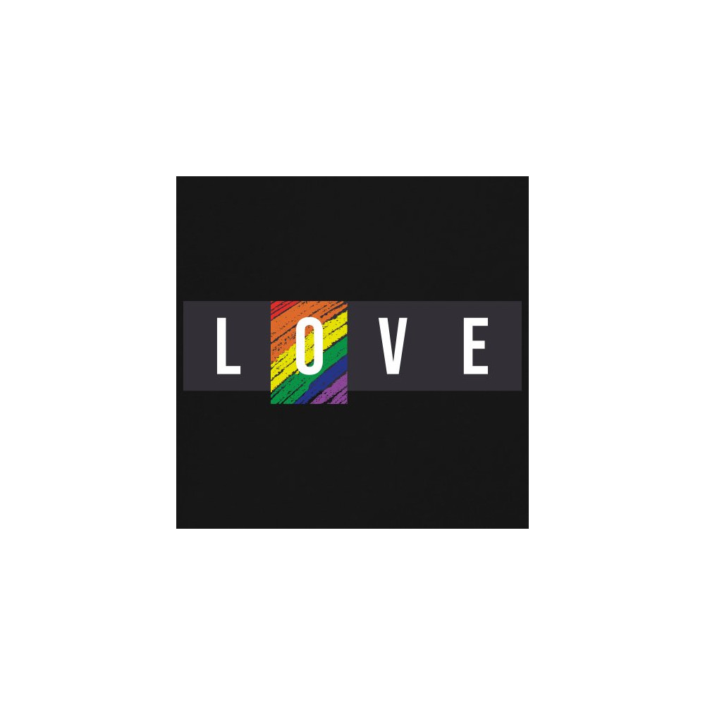 A print featuring the word "Love" written over a black rectangle with a fraction of a distressed rainbow in a square shape. Great choice to wear as a proud queer person.
