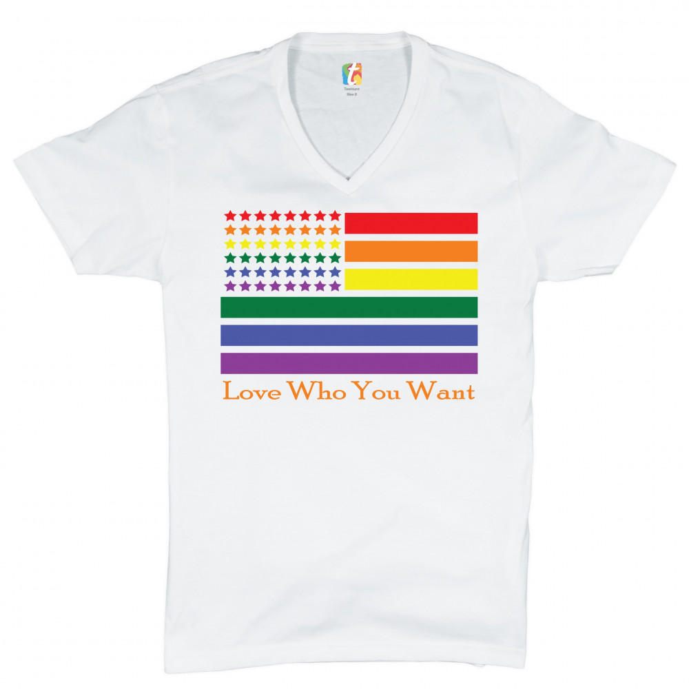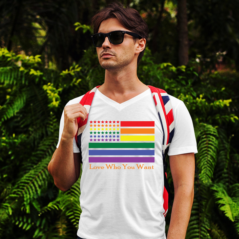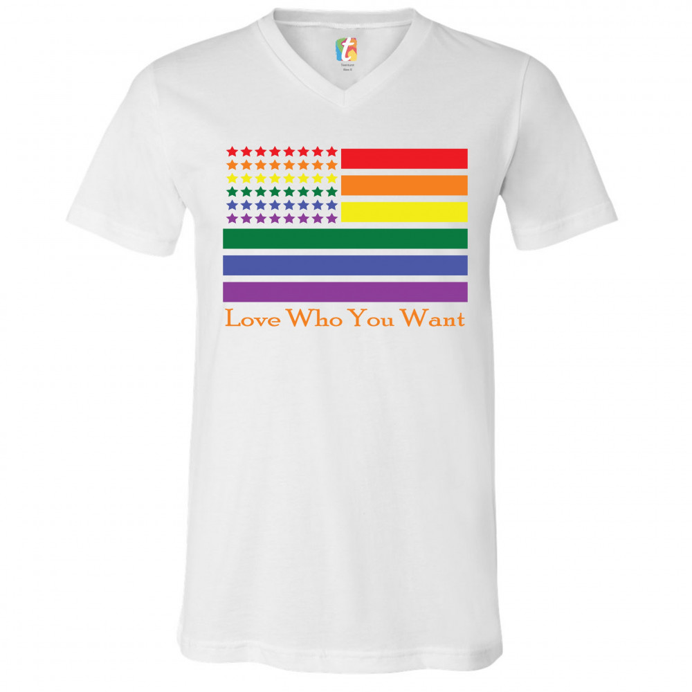 LOVE WHO YOU WANT v-neck t-shirt american gay pride rainbow flag lgbt tee white