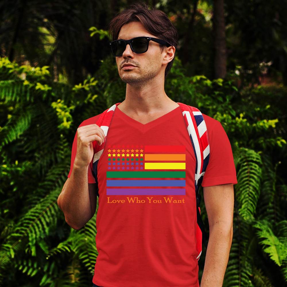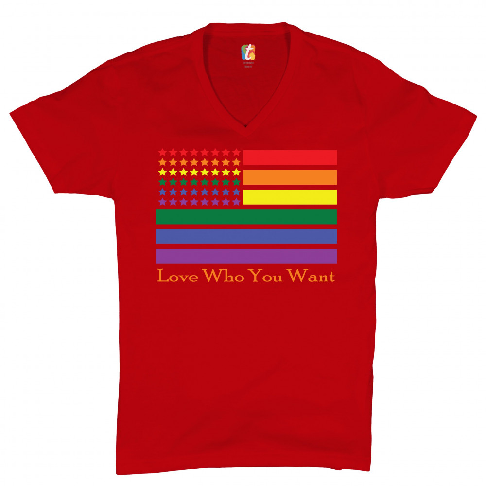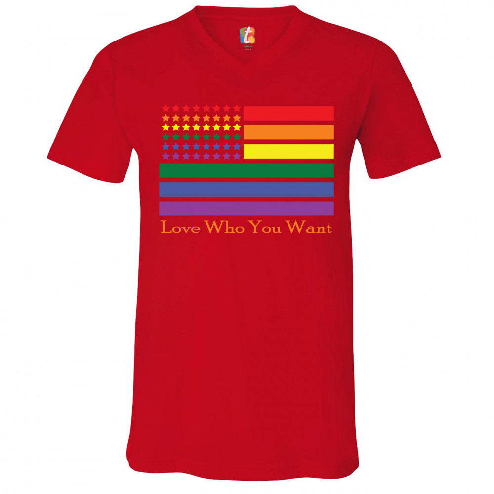LOVE WHO YOU WANT v-neck t-shirt american gay pride rainbow flag lgbt tee red