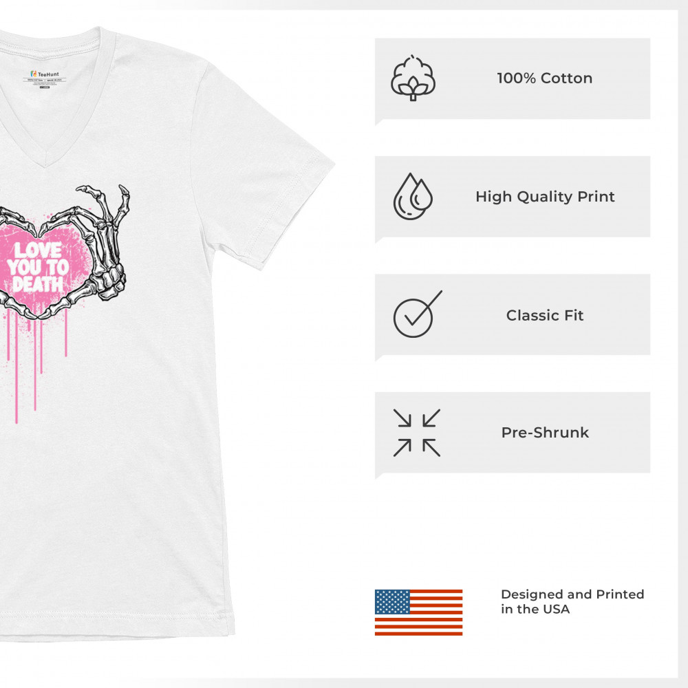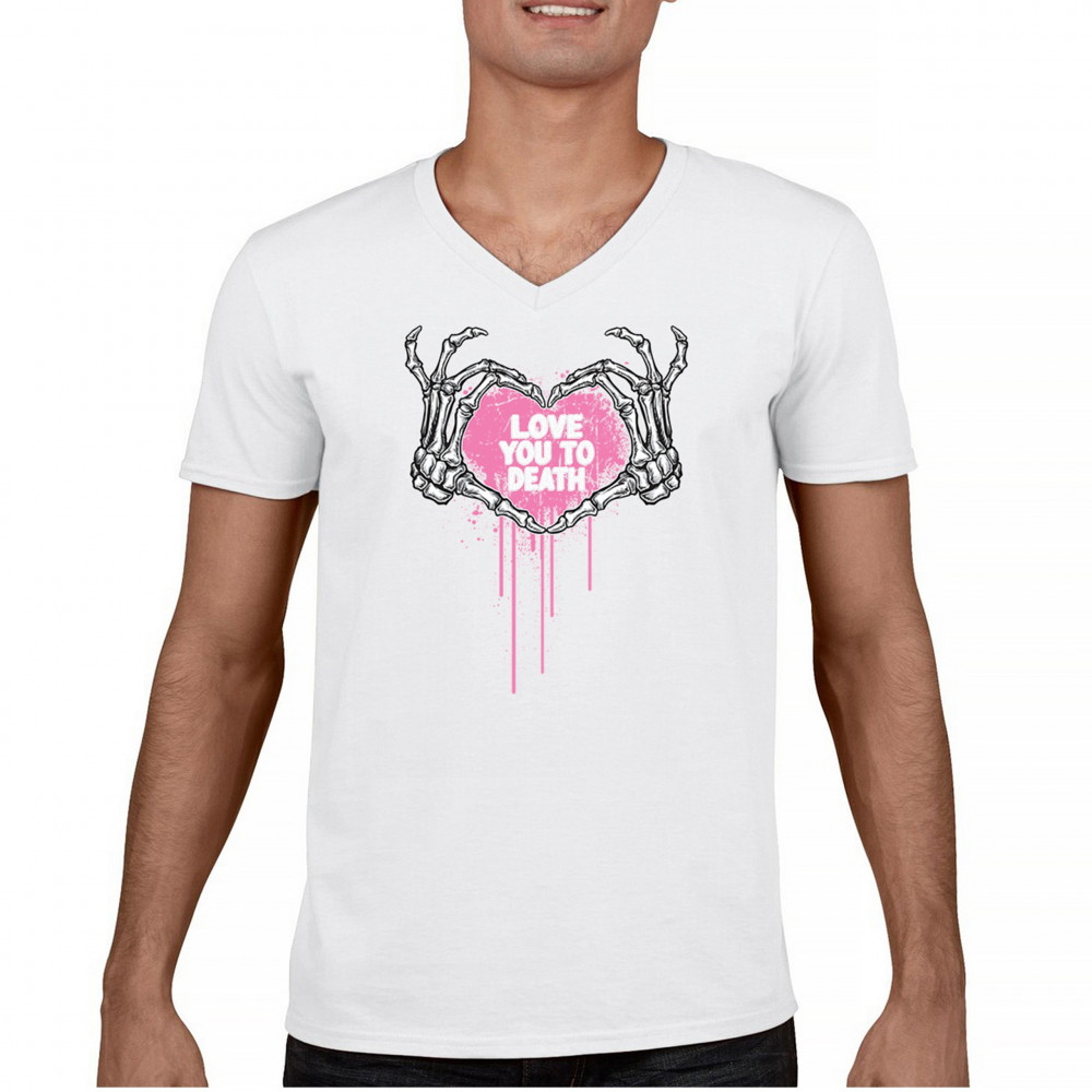 Show your spooky side with this skeleton hands heart design featuring a pink background and the phrase "Love You to Death." A perfect piece for alternative couples, Halloween lovers, and romantic rebels who embrace both affection and dark humor. Great for spooky season, date nights, and alt fashion outfits.