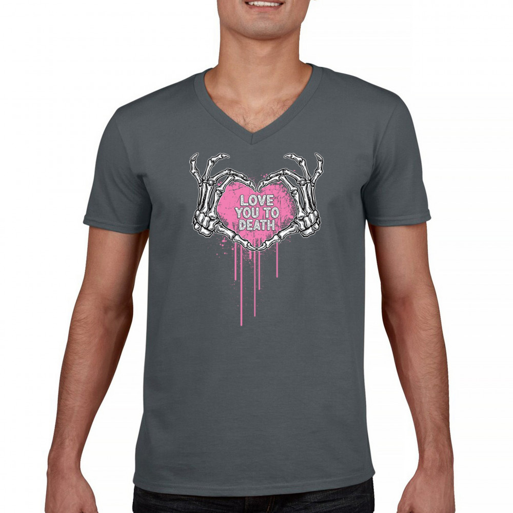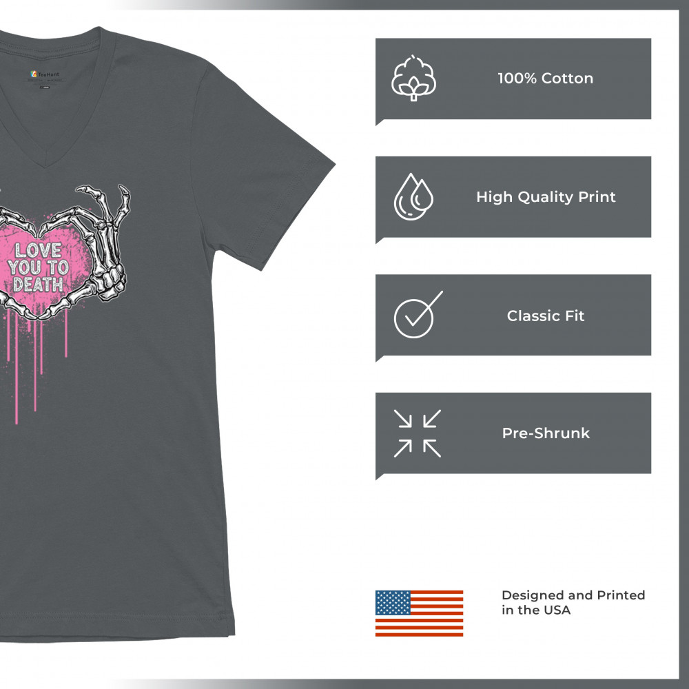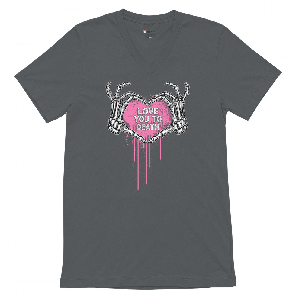 Show your spooky side with this skeleton hands heart design featuring a pink background and the phrase "Love You to Death." A perfect piece for alternative couples, Halloween lovers, and romantic rebels who embrace both affection and dark humor. Great for spooky season, date nights, and alt fashion outfits.