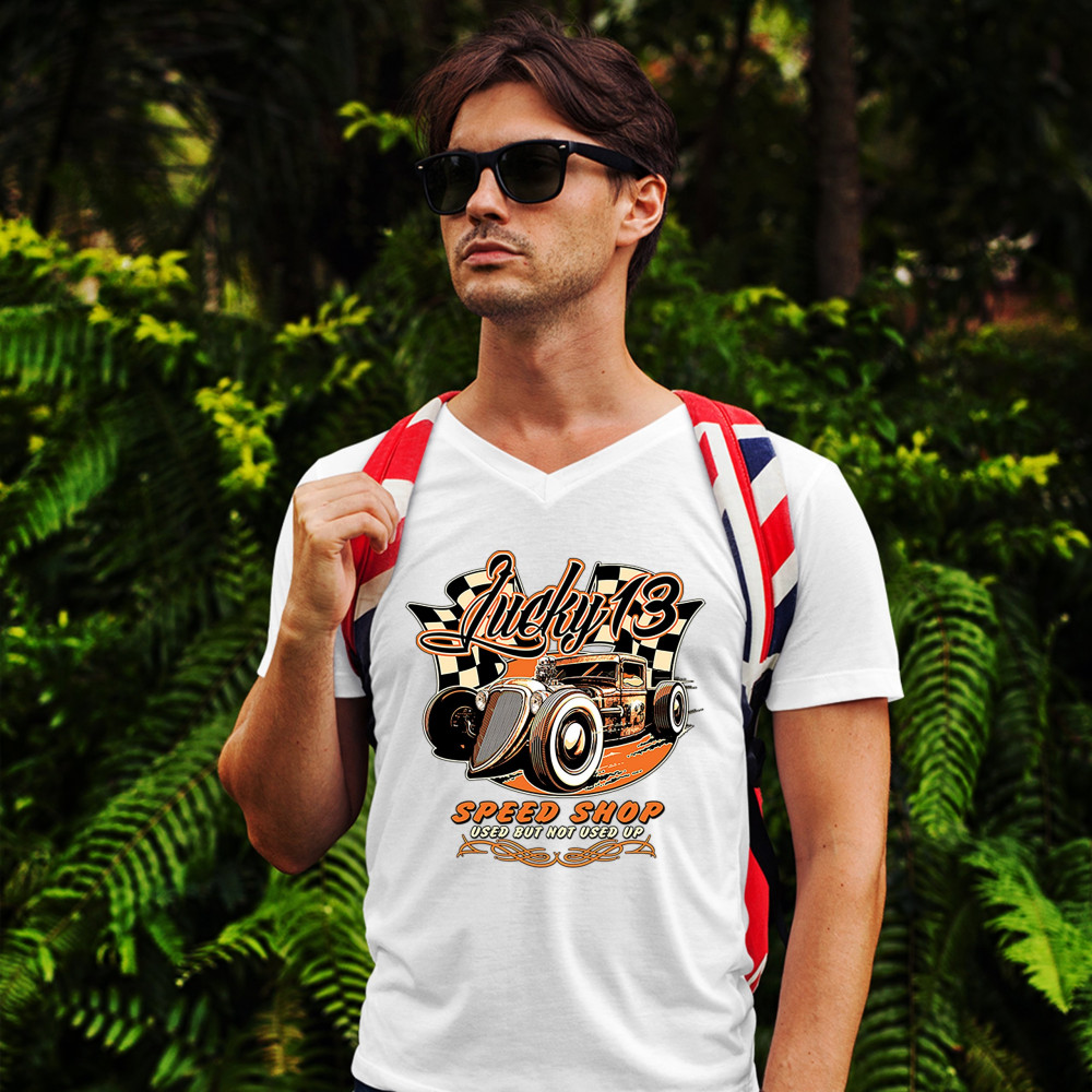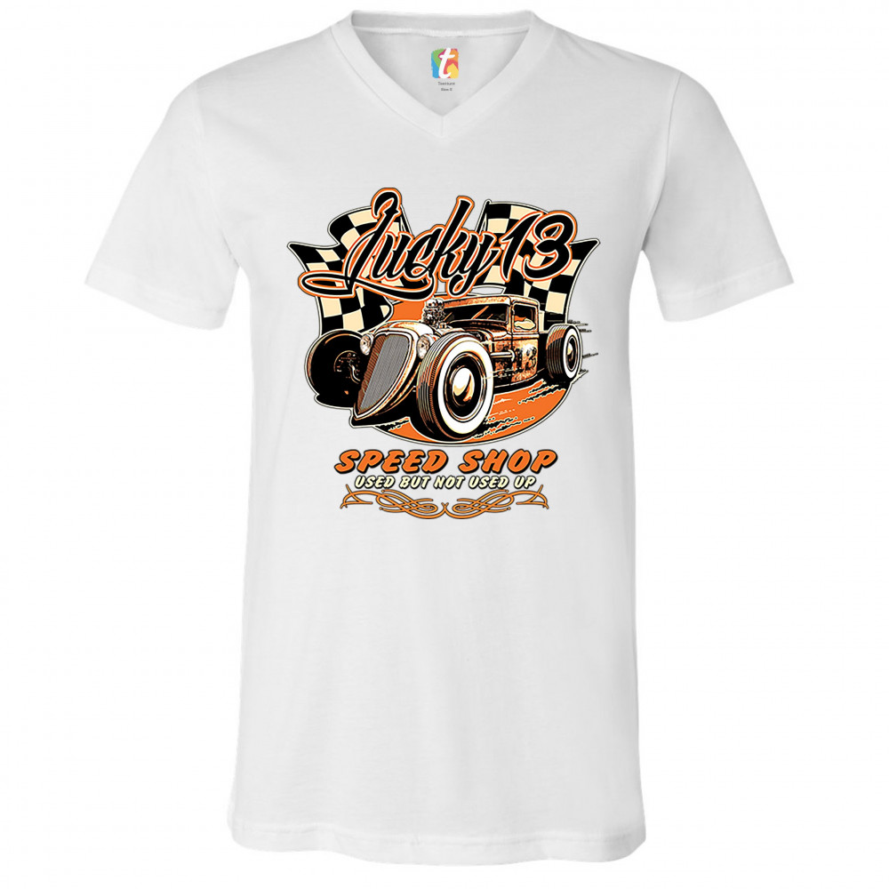 LUCKY 13 SPEED SHOP v-neck t-shirt rat rod route 66 vintage racing car tee white