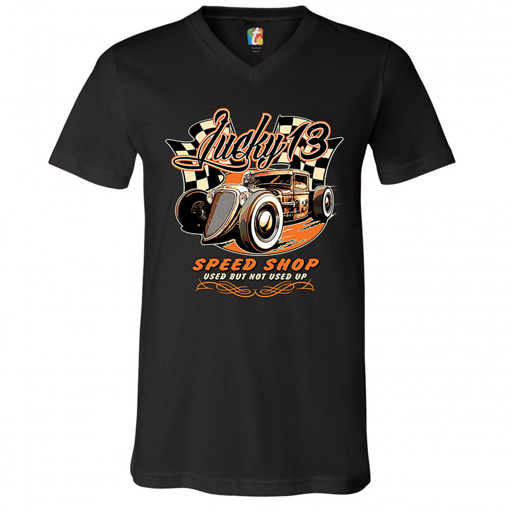 LUCKY 13 SPEED SHOP v-neck t-shirt rat rod route 66 vintage racing car tee black