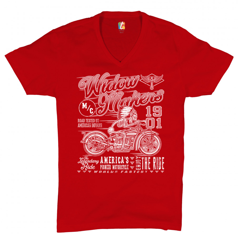 A print featuring a skeleton wearing a native American warbonnet and riding a bobber motorcycle. There is also a logo with a winged piston in the top right corner. The print says: "M/C Widowmakers 1901, road tested by American Indians, the legendary ride,
