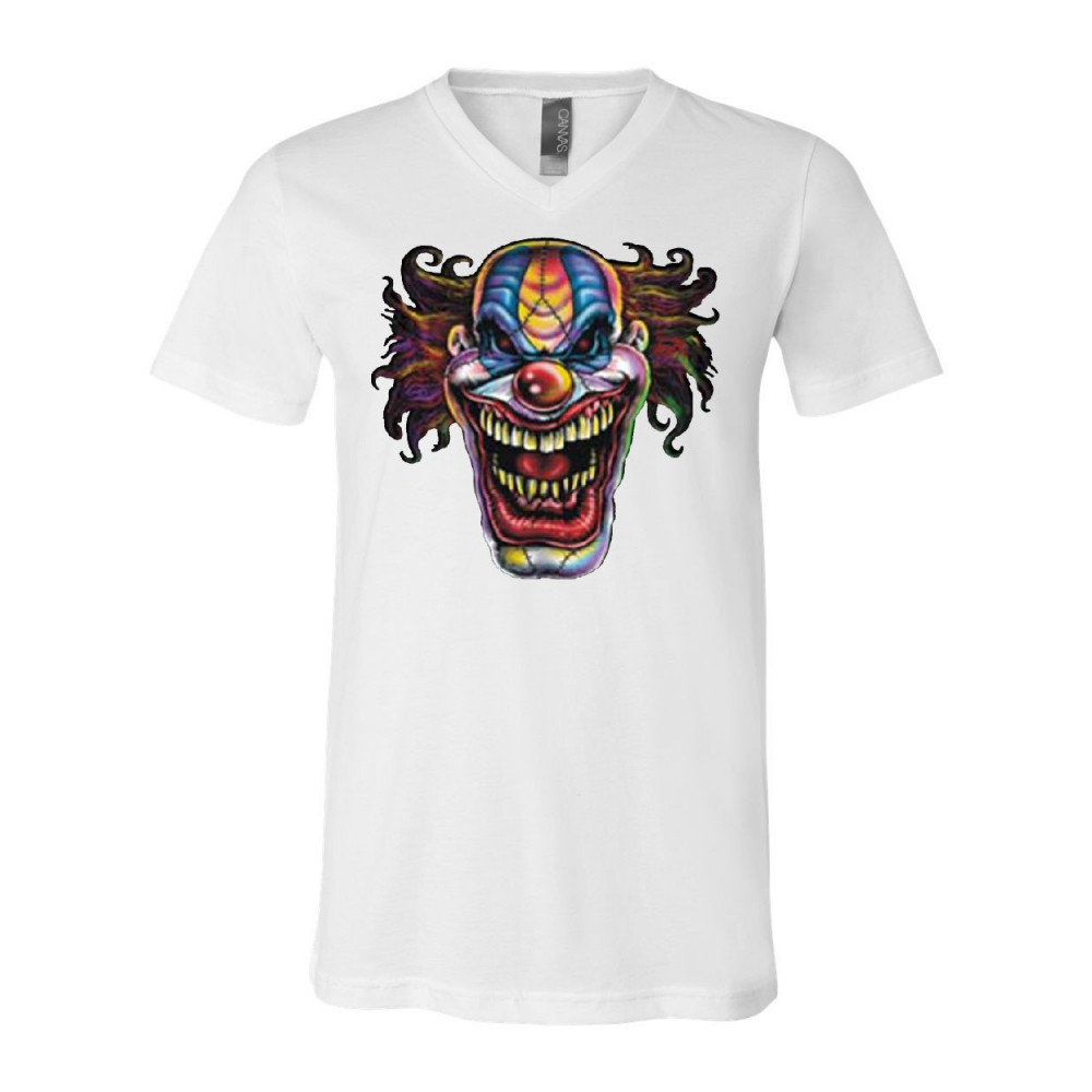 MAD EVIL CLOWN FACE v-neck t-shirt scary horror insane joker tee white