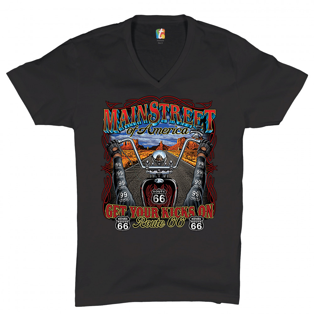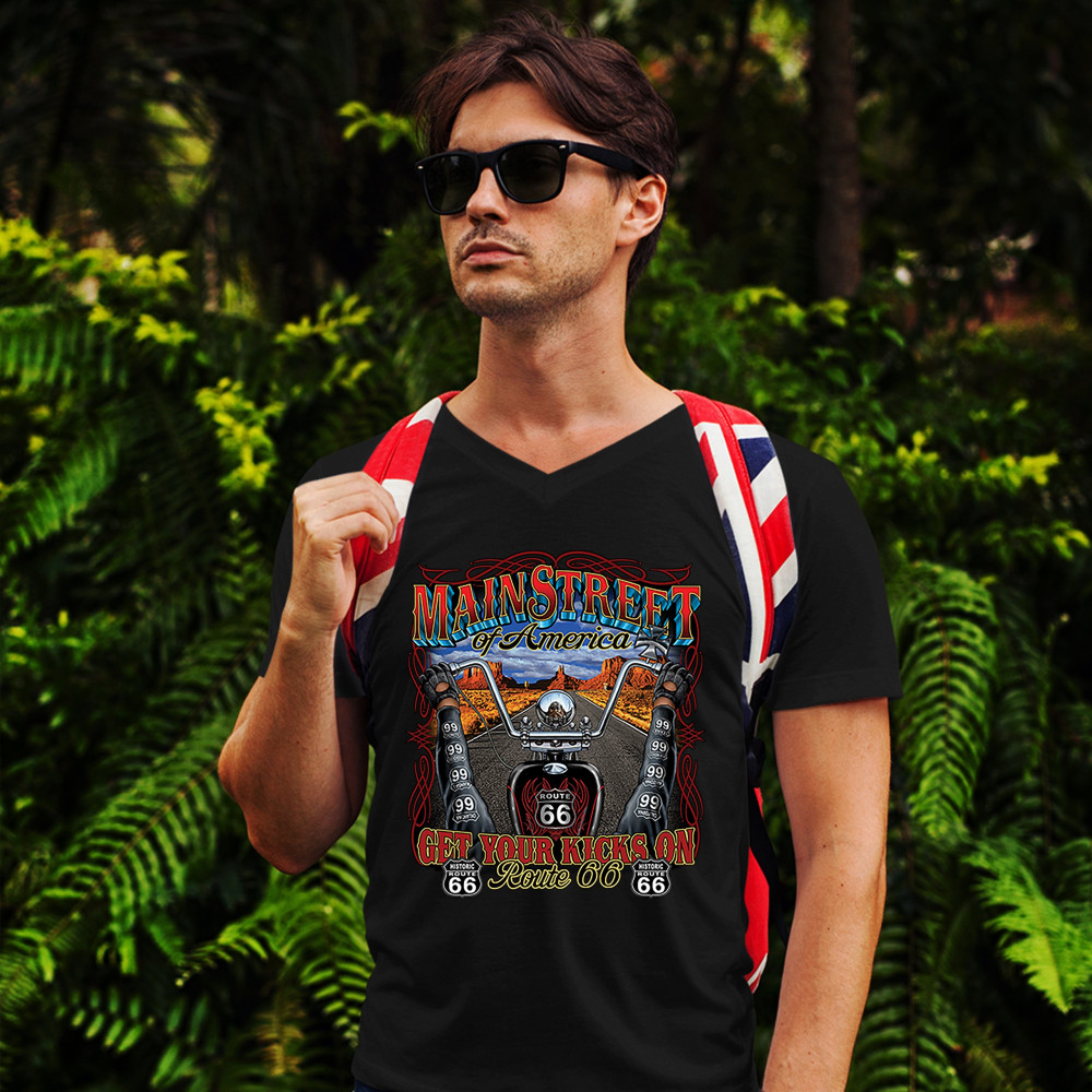 A print featuring a POV of a biker riding a chopper on a Route 66. There are are numerous "Route 66" and "Historic Route 66" signs all over the print and the print says: "Main street of America" and "Gwt your kicks on Route 66". A great choice for a motor