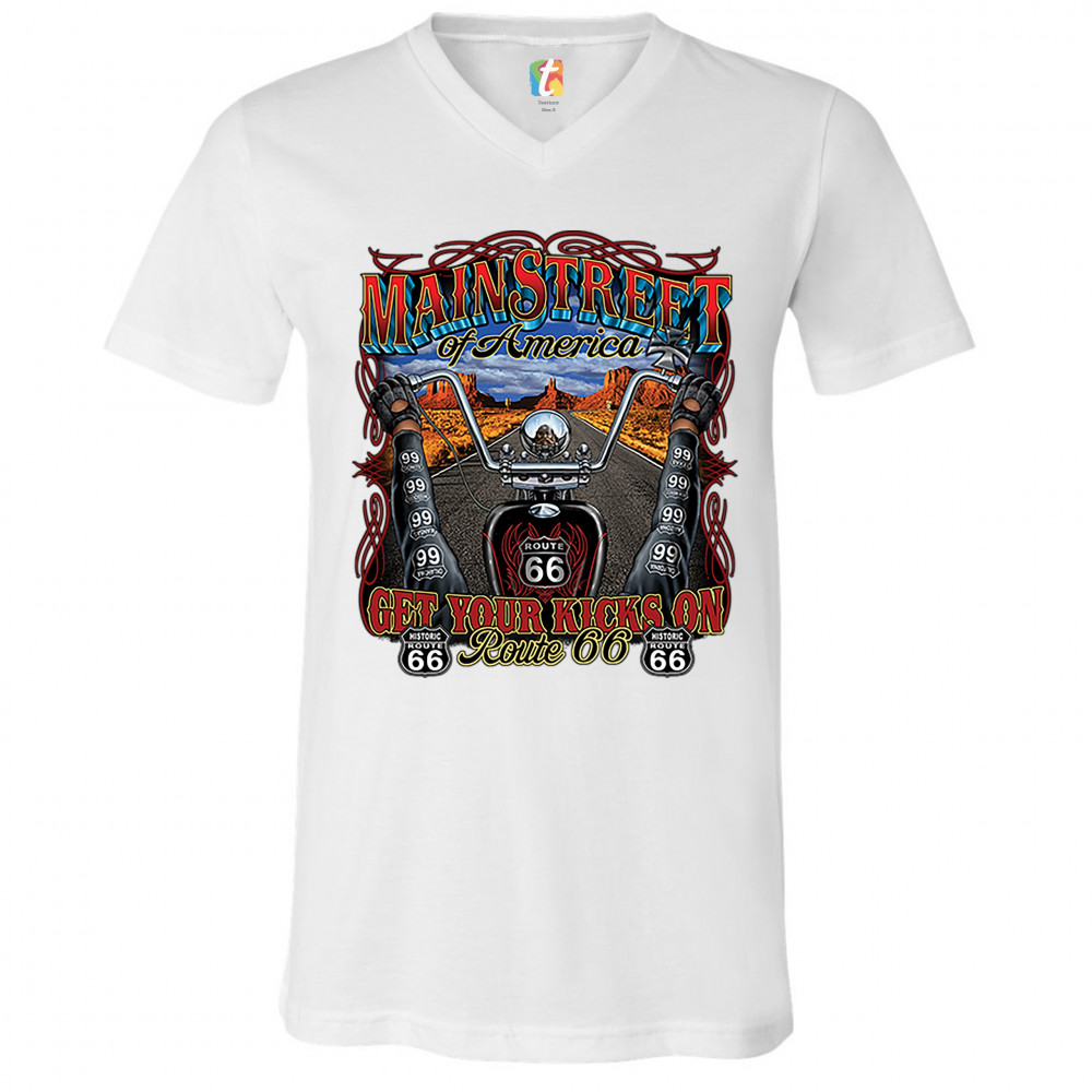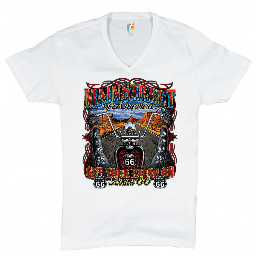A print featuring a POV of a biker riding a chopper on a Route 66. There are are numerous "Route 66" and "Historic Route 66" signs all over the print and the print says: "Main street of America" and "Gwt your kicks on Route 66". A great choice for a motor