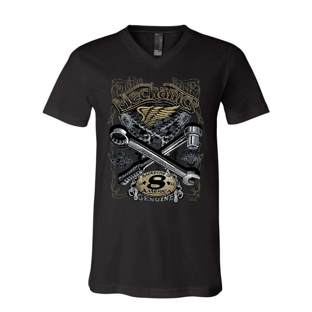 MECHANICS - BACKBONE OF AMERICA mechanics backbone of america v-neck t-shirt engine repair blue collar tee black