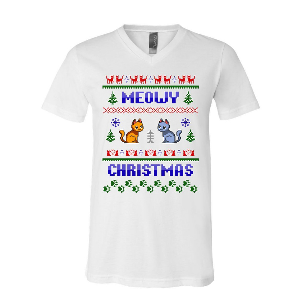 MEOWY CHRISTMAS UGLY SWEATER v-neck t-shirt cat kitten purr merry xmas tee white