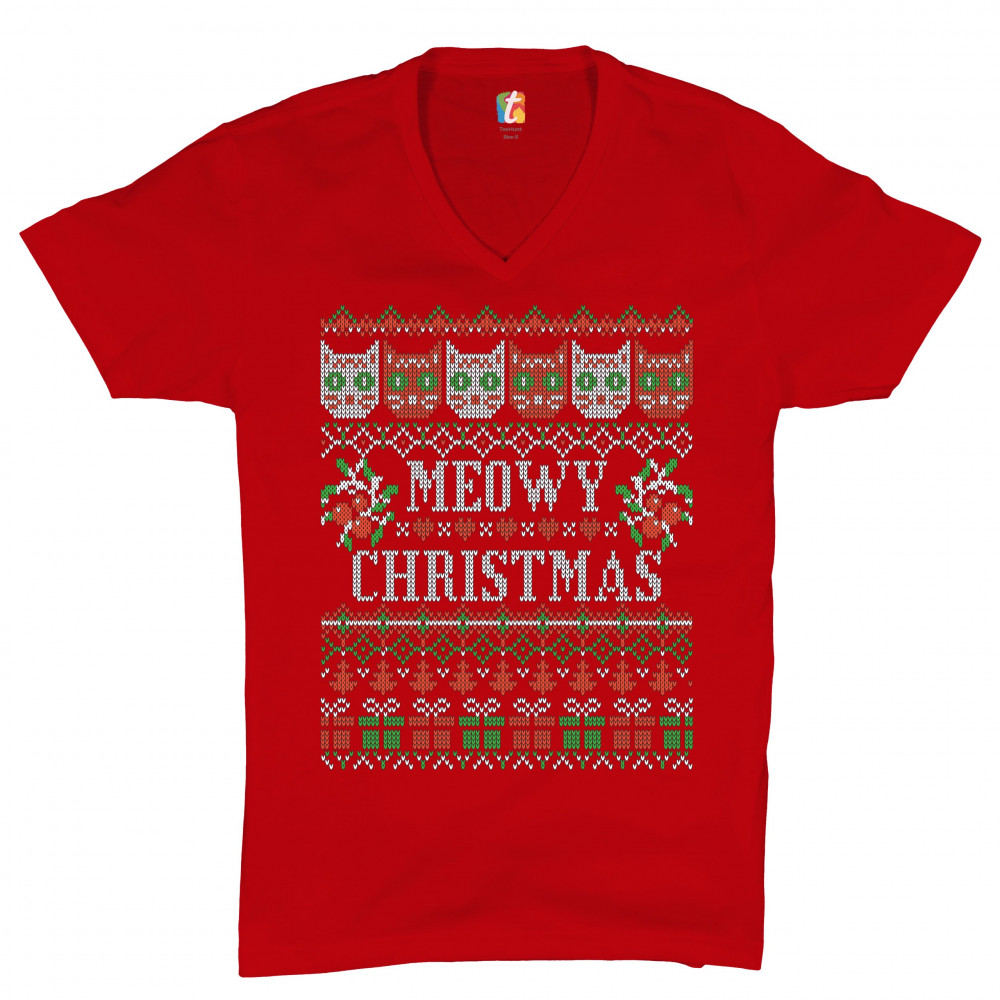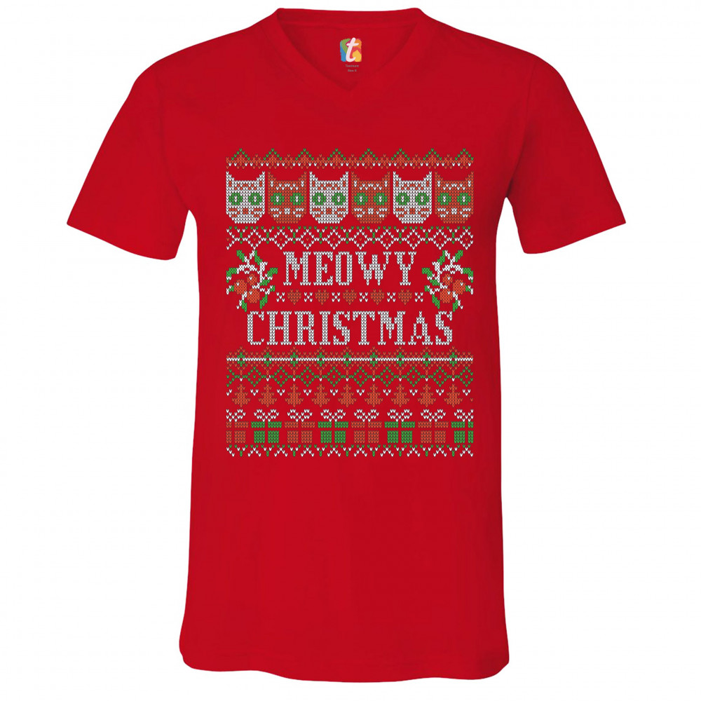 MEOWY CHRISTMAS v-neck t-shirt ugly sweater cat lover funny xmas tee red