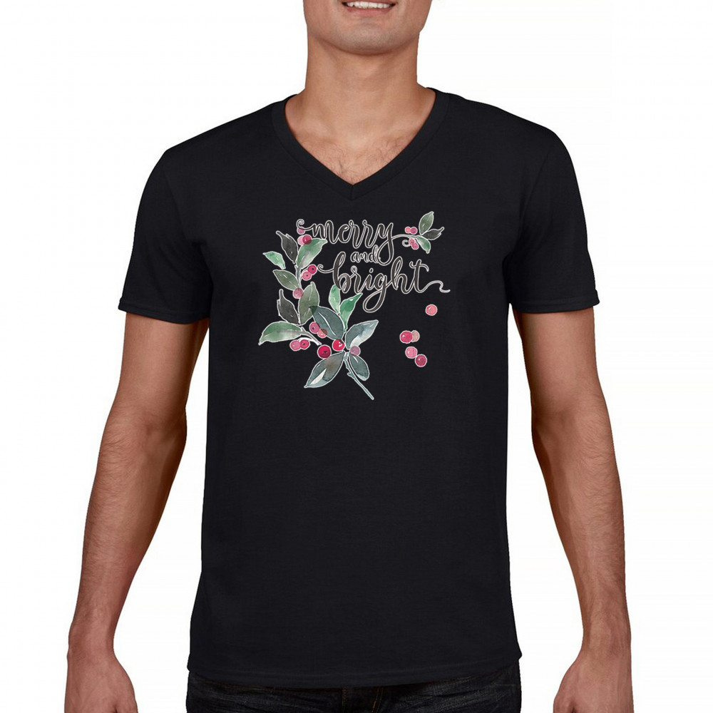 MERRY AND BRIGHT CUTE CHRISTMAS v-neck t-shirt jolly santa clause xmas tee black