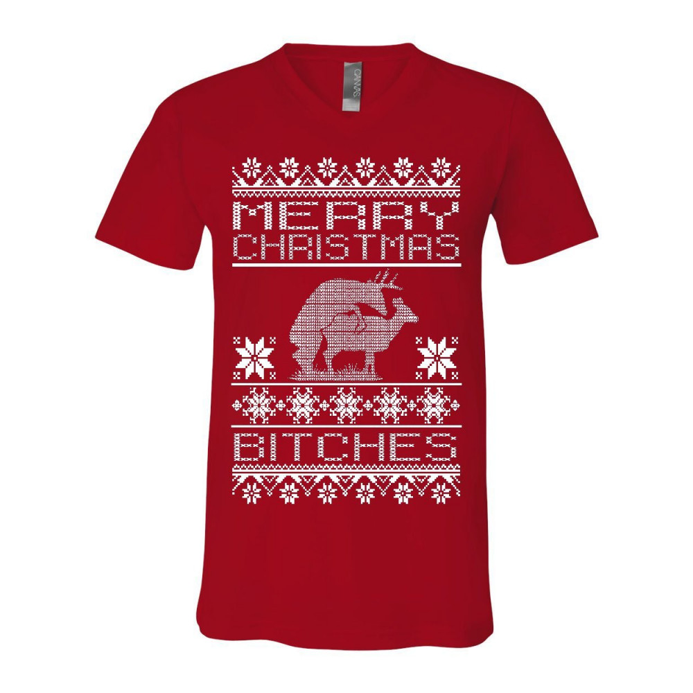 MERRY CHRISTMAS BITCHES v-neck t-shirt deer humping ugly sweatshirt red