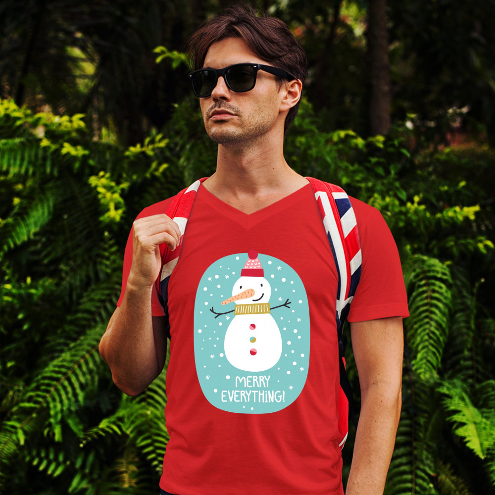 A print featuring a happy snowman with a carrot nose wearing a hat and a scarf smiling and spreading it's hands. It is snowing and below the snowman it says: "Merry Christmas". Amazing choice to make people smile and spread positive vibes on Christmas Eve
