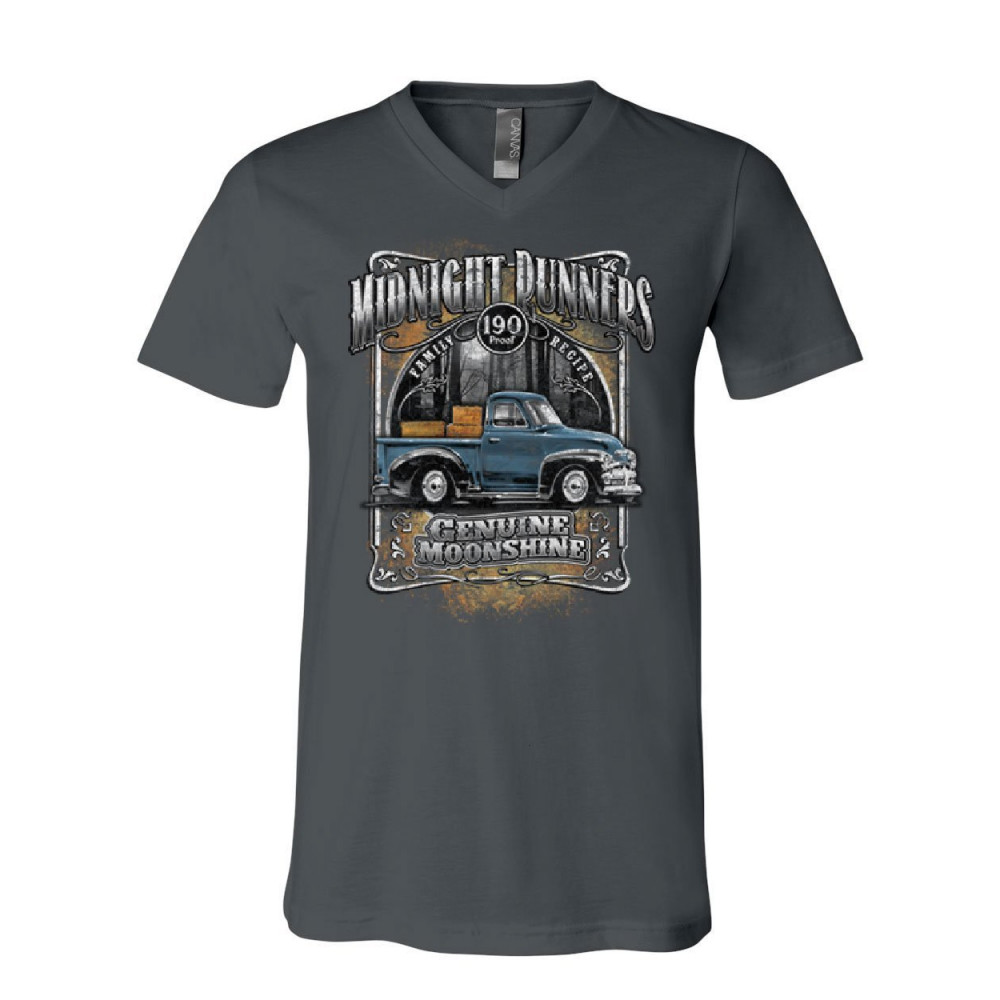 MIDNIGHT RUNNERS v-neck t-shirt genuine moonshine drinking whisky booze tee charcoal