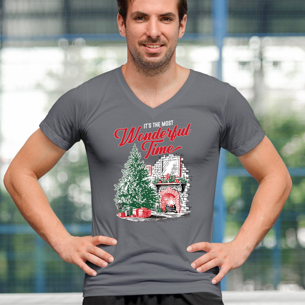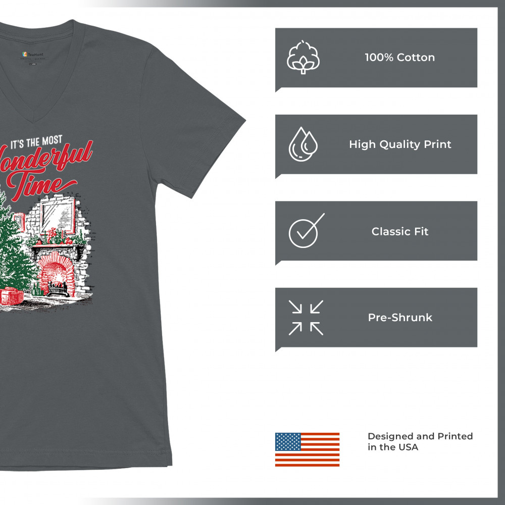 Make your holidays brighter with this “Most Wonderful Time†Christmas design, featuring a glowing fireplace, festive living room, and decorated Christmas tree. This cozy Christmas shirt combines holiday home decor style with classic Merry Xmas charm. Perfect for those who love Santa Claus, Rudolph, reindeer, Let It Snow vibes, and cheerful holiday fashion.