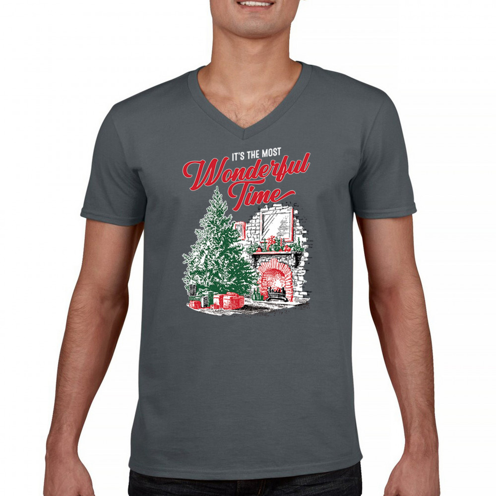 Most Wonderful Time Christmas shirt – cozy holiday design with fireplace scene, Christmas tree, Santa Claus, Rudolph, and festive living room charm.