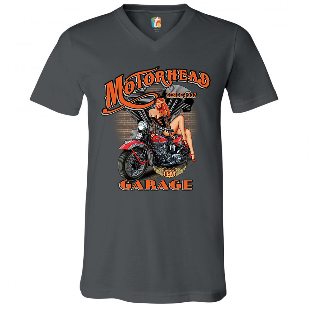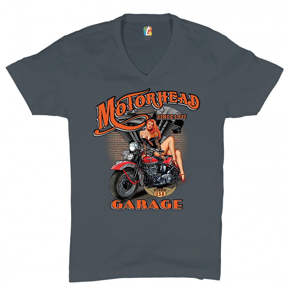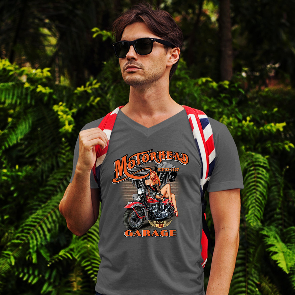 A print featuring a sexy pin-up girl sitting on a motorcycle. In the background there is a motorcycle engine and a brick wall. The print says: "Motorhead Garage since 1937" and features a "Made in the USA" sign. A great choice for a motorcycle enthusiast.
