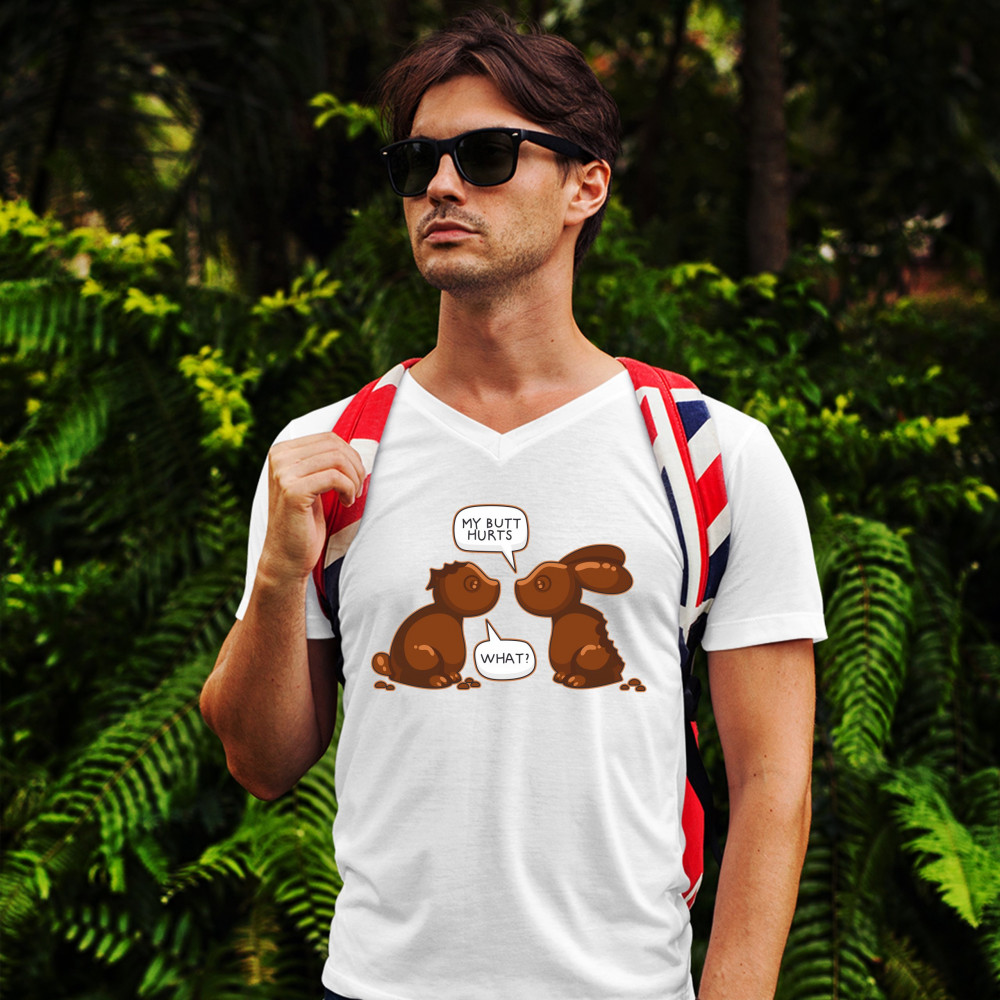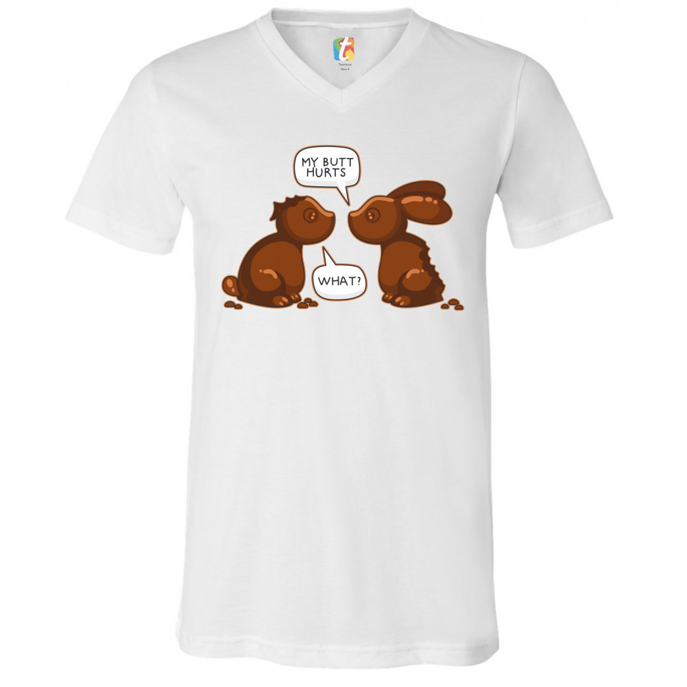 MY BUTT HURTS - WHAT? v-neck t-shirt chocolate bunnies easter rabbits tee white