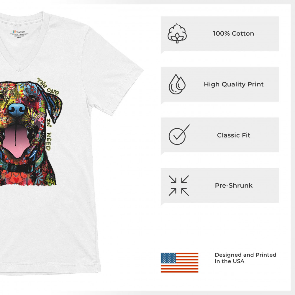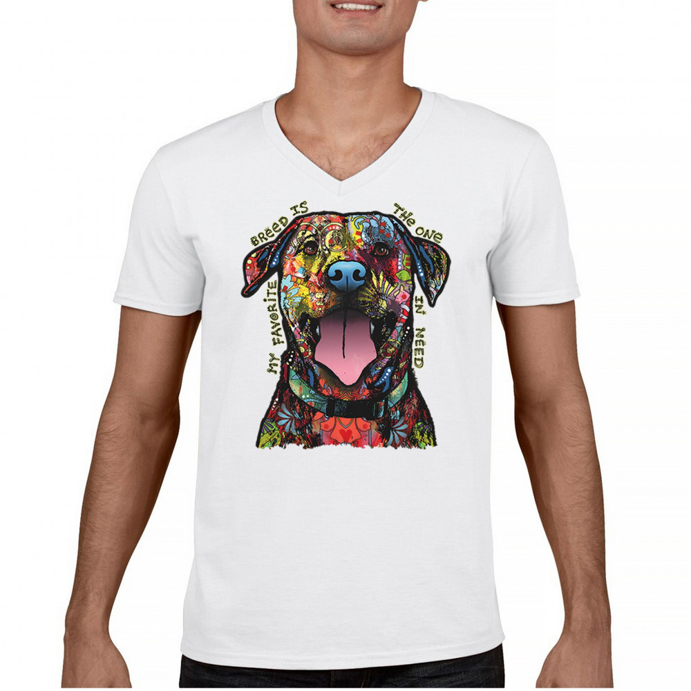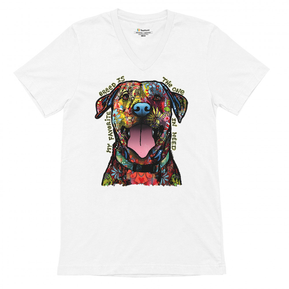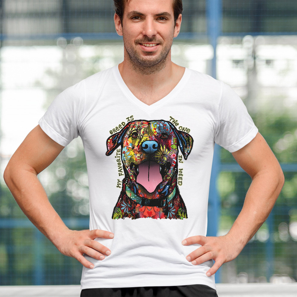 MY FAVORITE BREED IS THE ONE IN NEED v-neck t-shirt dean russo neon dog tee white