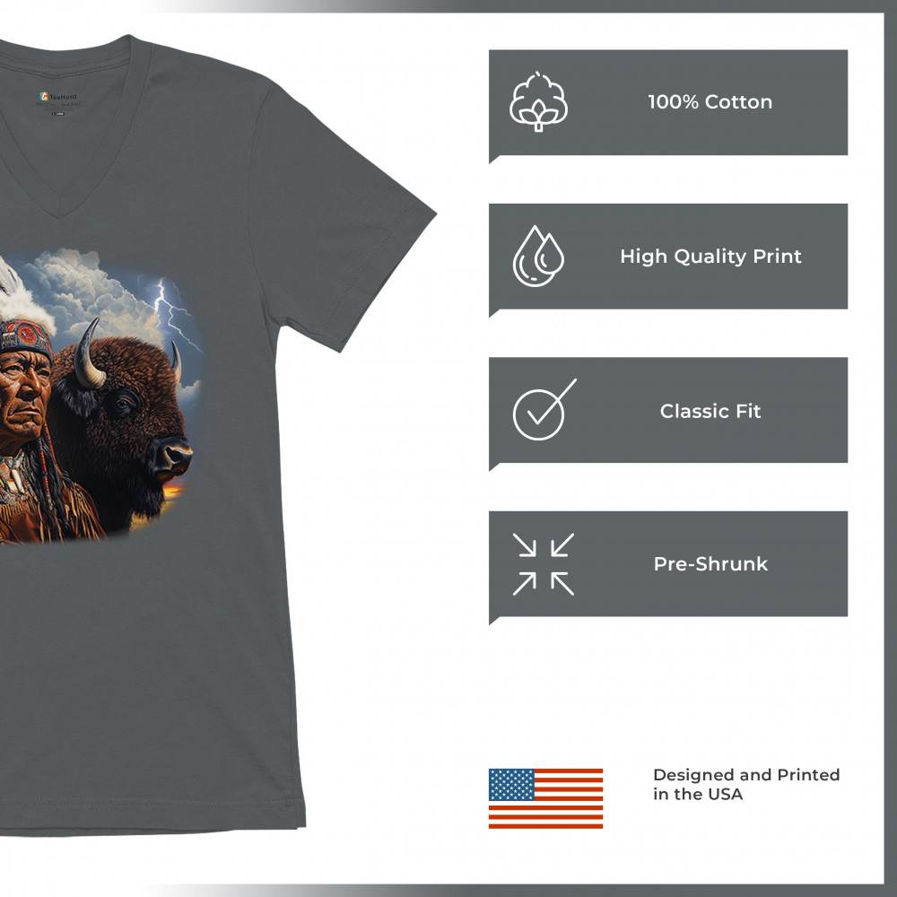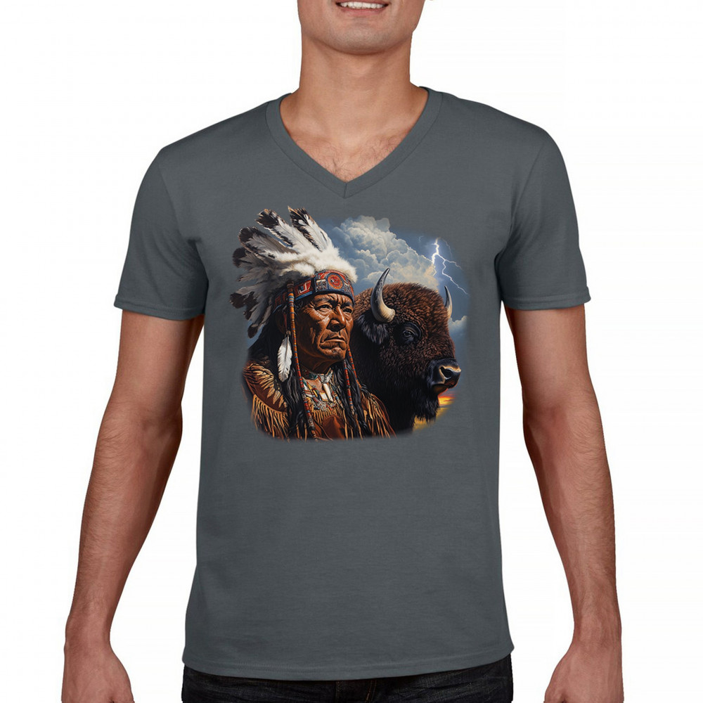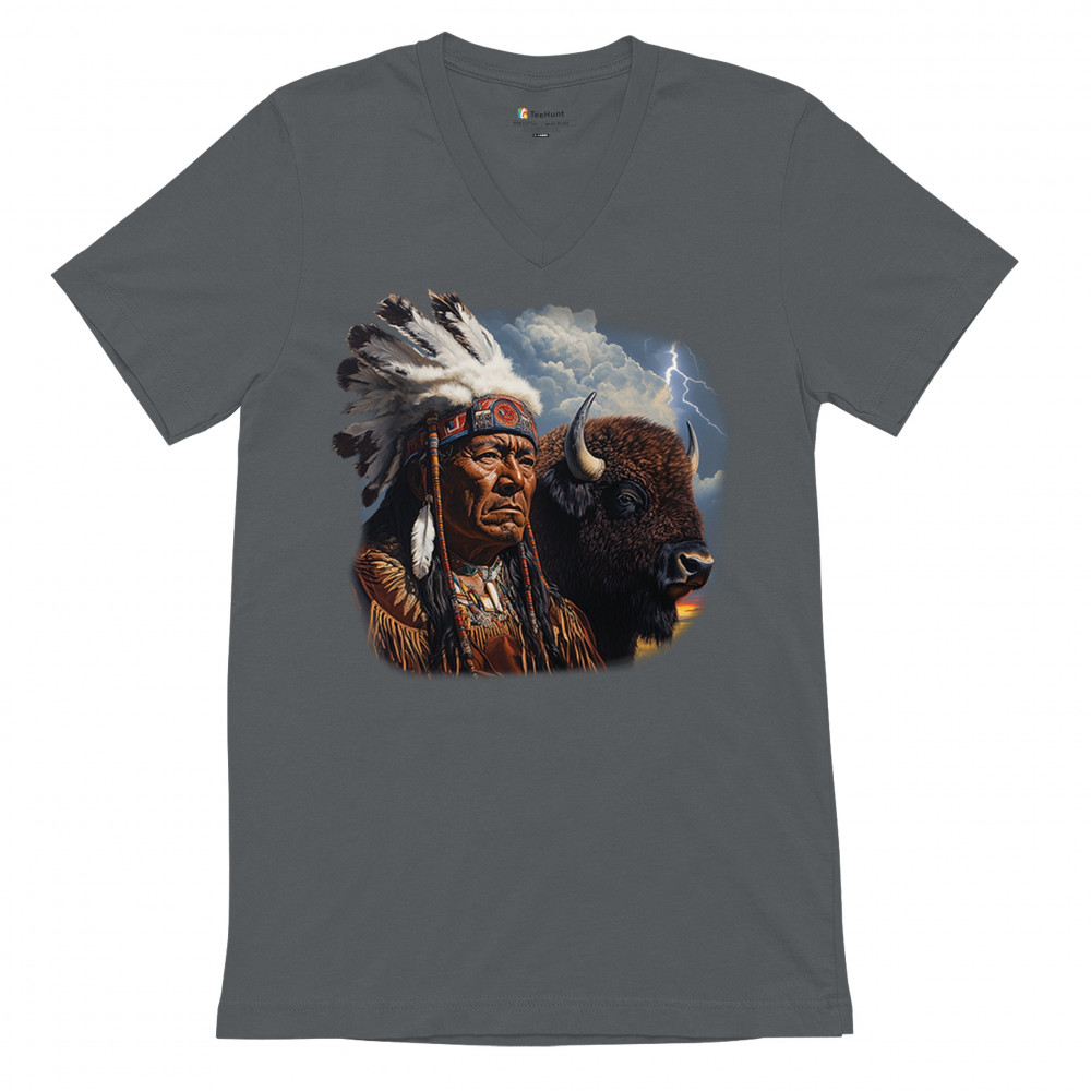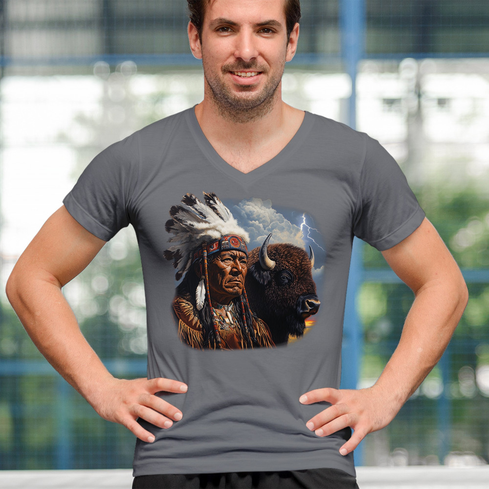 Bold tribal elder and bison design framed by lightning sky—honoring heritage, strength, resilience, and sacred connection to nature.