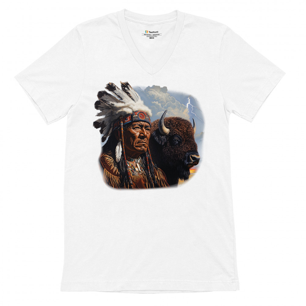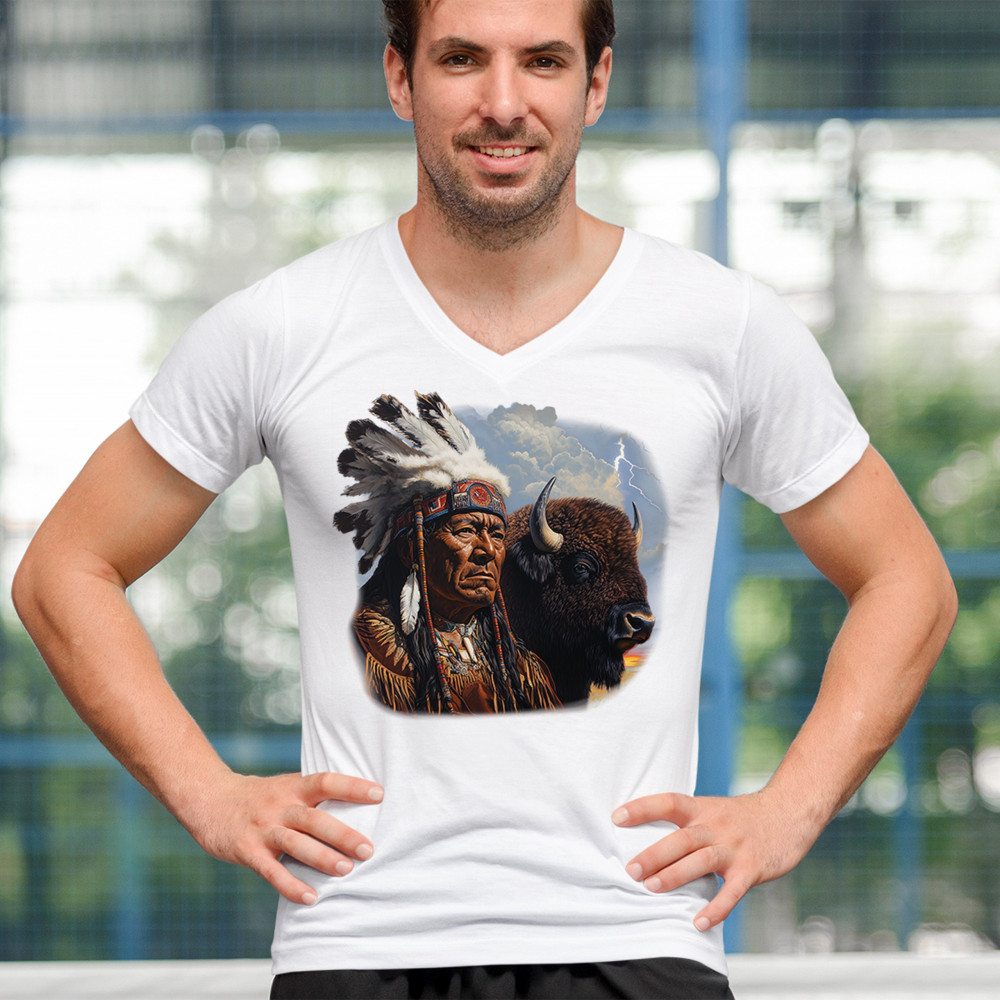 Bold tribal elder and bison design framed by lightning sky—honoring heritage, strength, resilience, and sacred connection to nature.