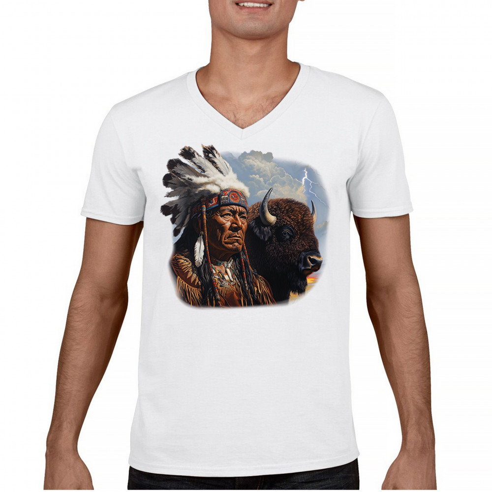 This powerful design features a Native American elder in traditional dress and feathered headdress beside a noble bison. Framed by a stormy sky and lightning, the art symbolizes tribal pride, spiritual harmony, ancestral strength, and a deep connection to nature’s raw energy.