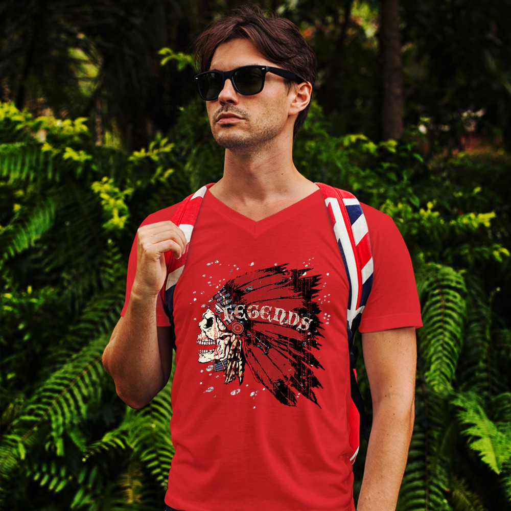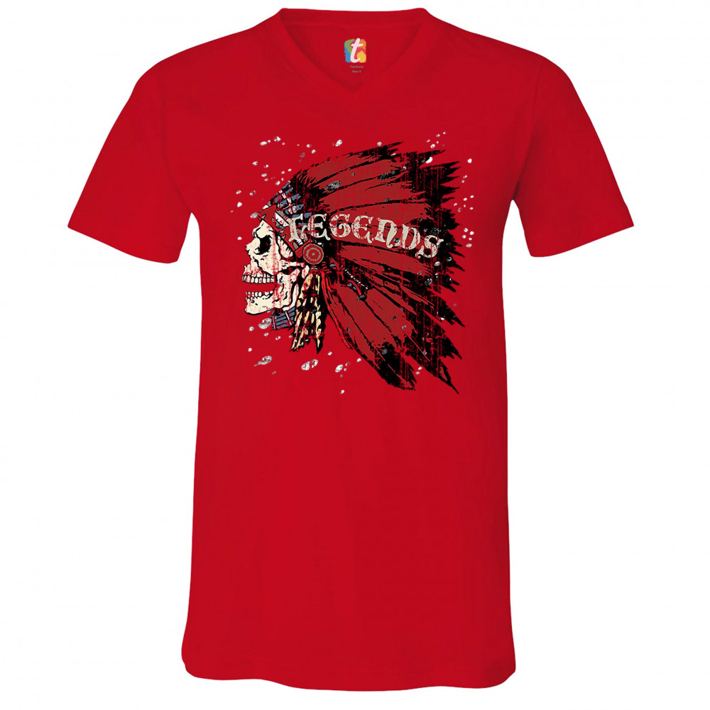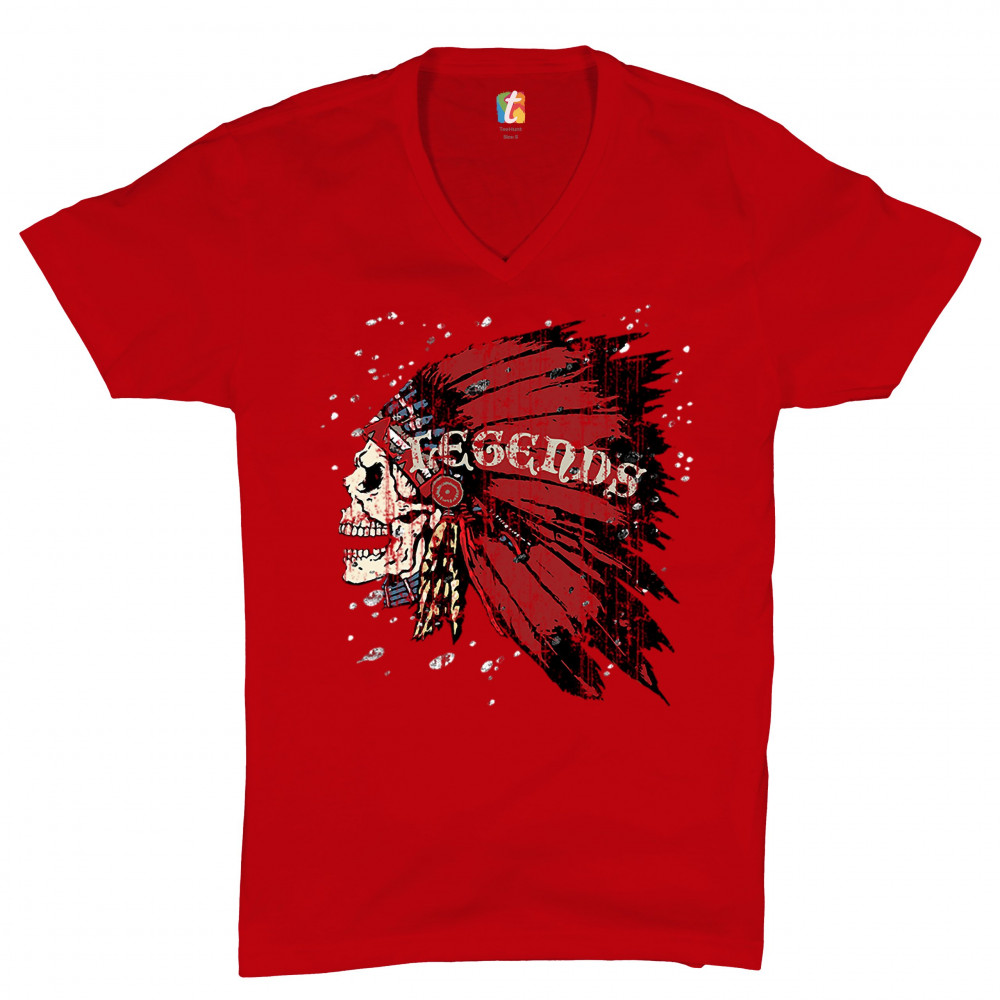 NATIVE AMERICAN LEGENDS v-neck t-shirt skull face war bonnet headdress tee red
