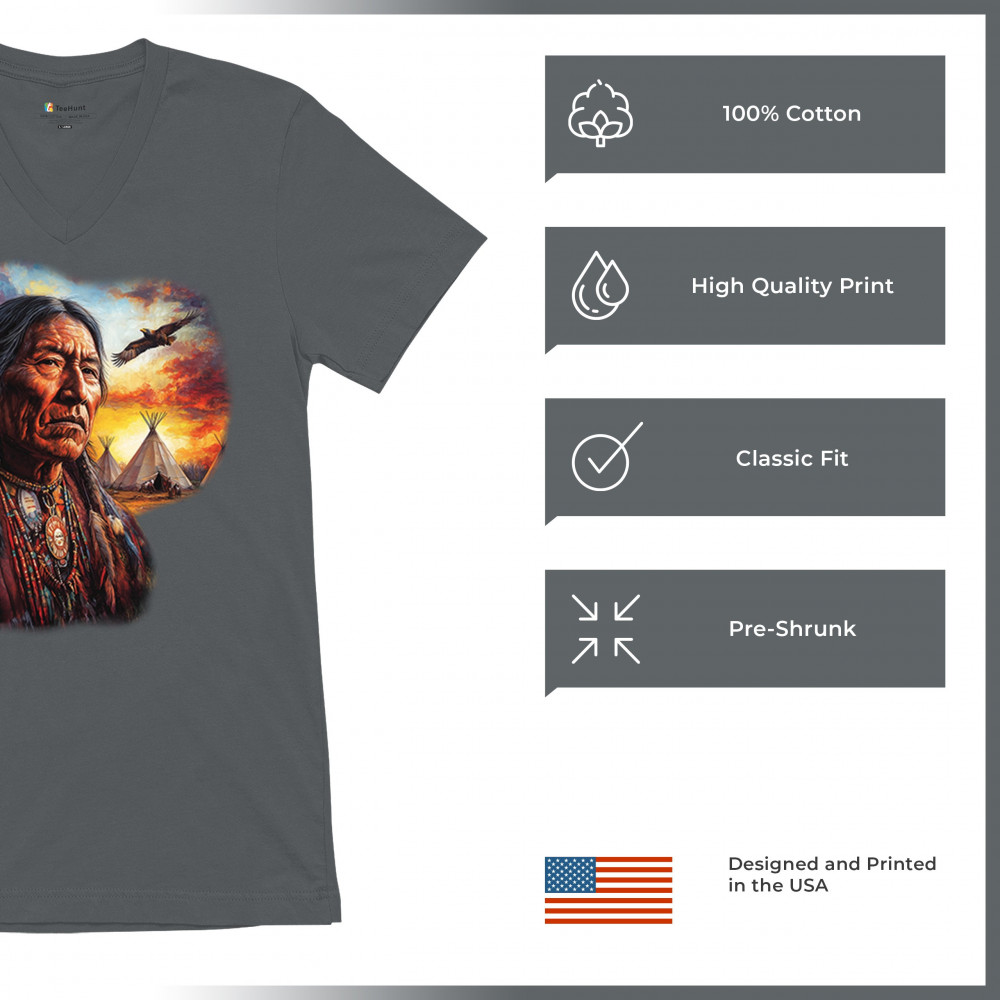 This vivid artwork features a Native American elder in traditional feathered attire, set before a blazing sunset with soaring eagles and peaceful teepees. The scene symbolizes strength, heritage, and spiritual wisdom. A heartfelt tribute to tribal pride, ancestral legacy, and cultural connection to land.