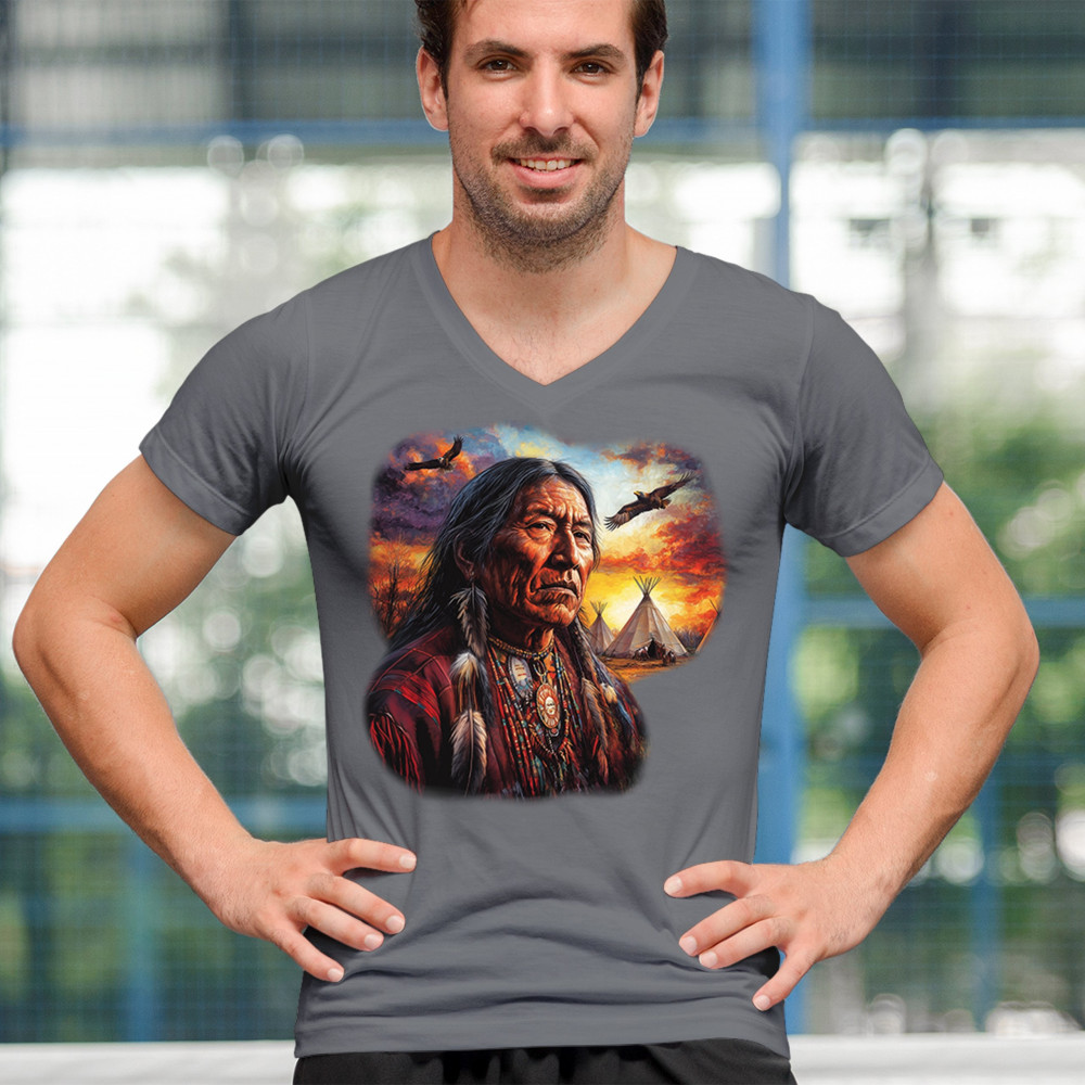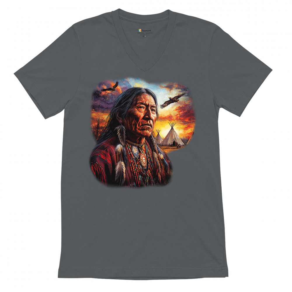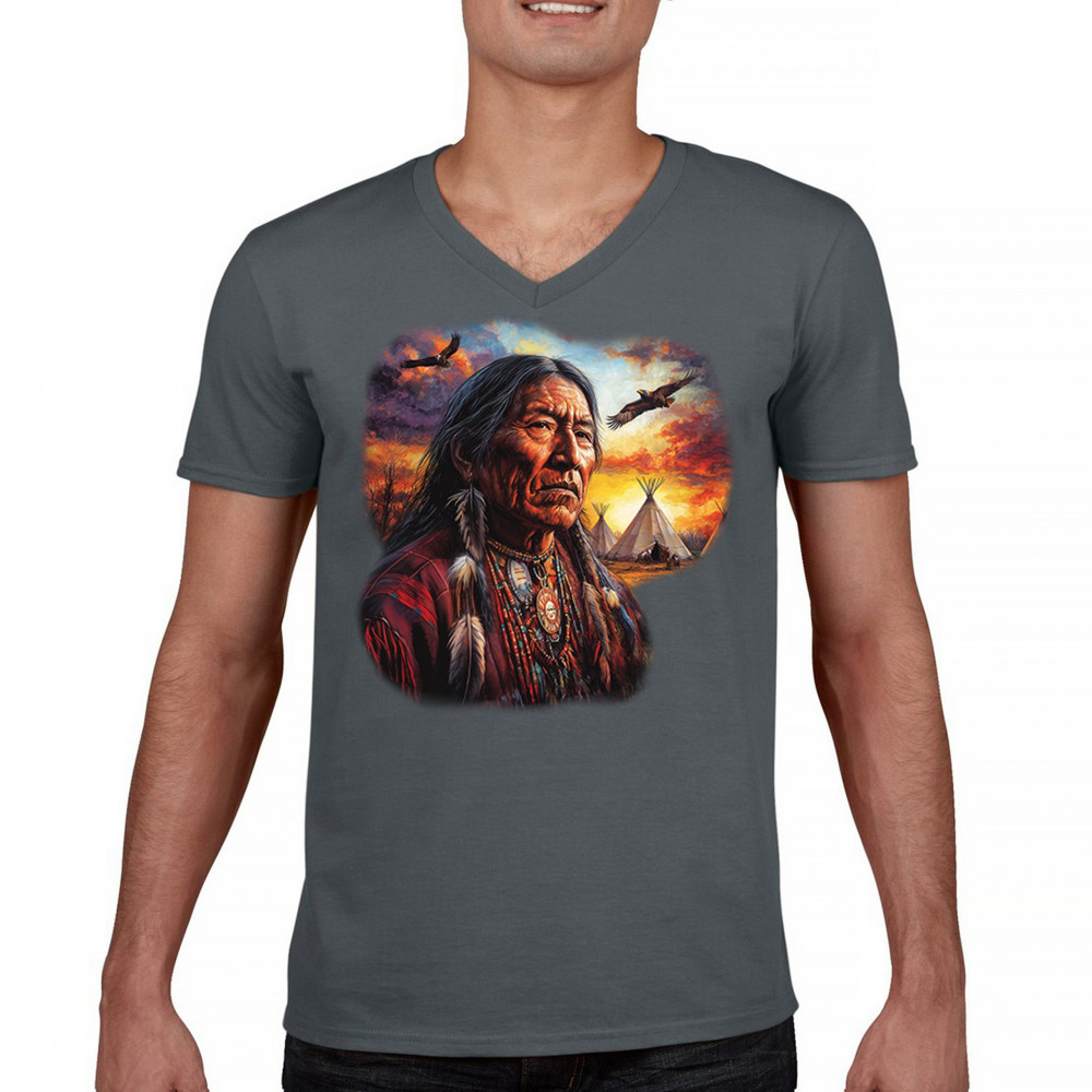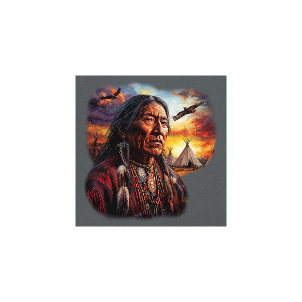 Native elder, teepees, sunset, and eagles come together in this spiritual design celebrating indigenous culture, heritage, and nature’s beauty.