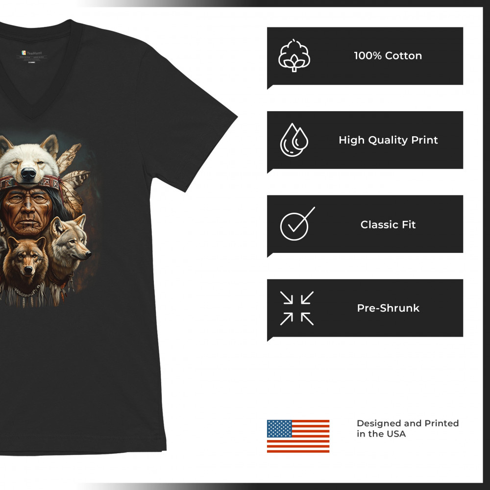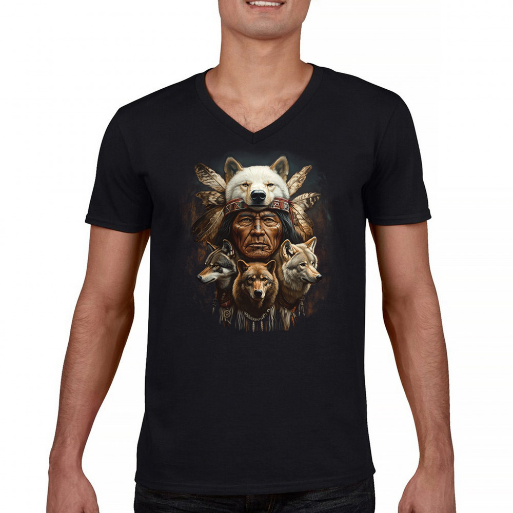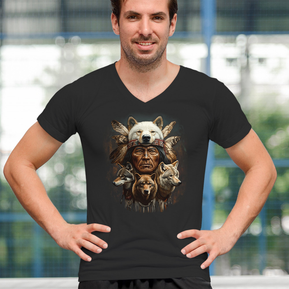 NATIVE AMERICAN WOLF CHIEF v-neck t-shirt headdress warrior wolves totem tee black