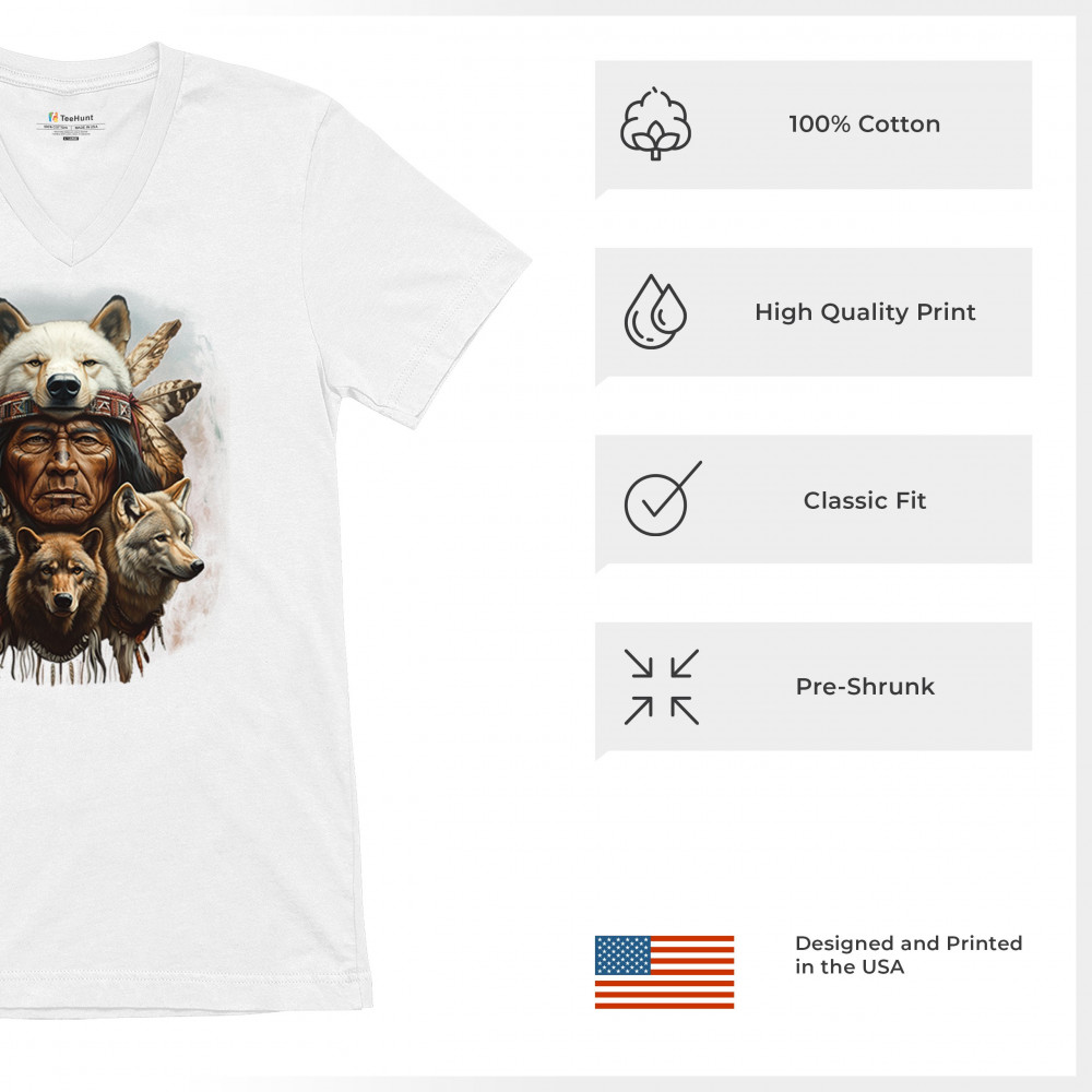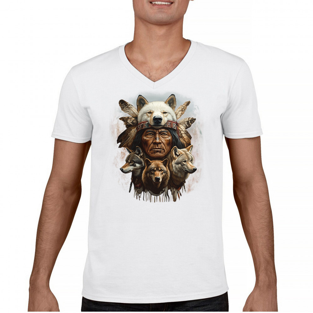 Wolf totem design with Native elder in headdress and guardian wolves. Symbolizes strength, loyalty, spirit animals, and tribal heritage.