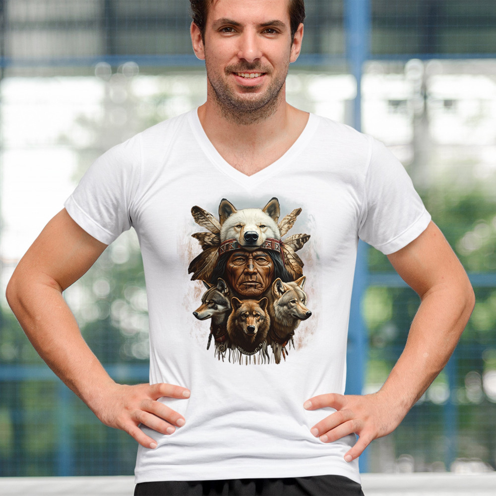 This spiritual tribal design showcases a Native American elder in a detailed wolf headdress surrounded by guardian wolves. It represents strength, loyalty, instinct, and sacred unity with nature. A powerful totem for honoring animal bonds, native pride, and ancestral spiritual guidance through the spirit of the wolf.