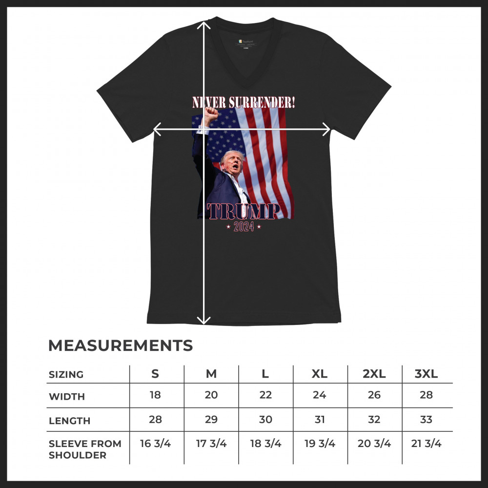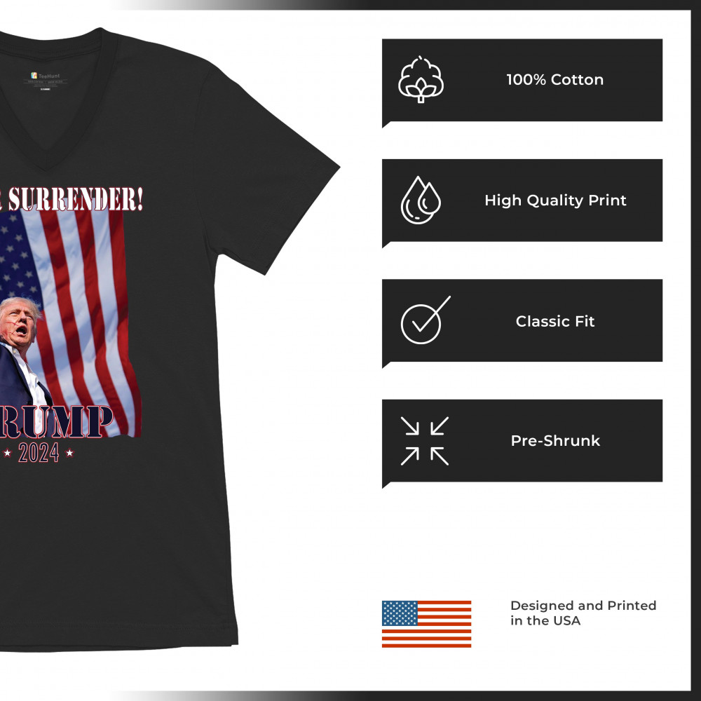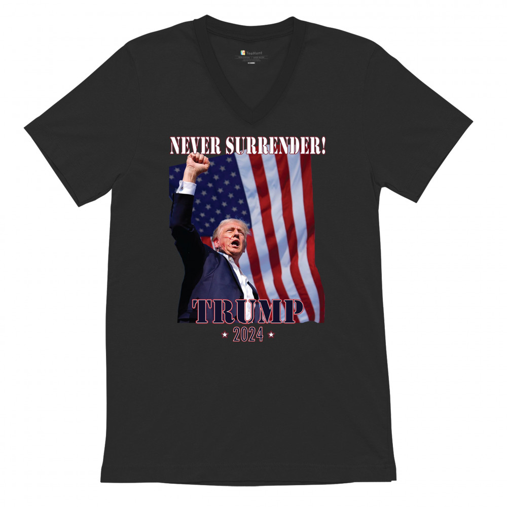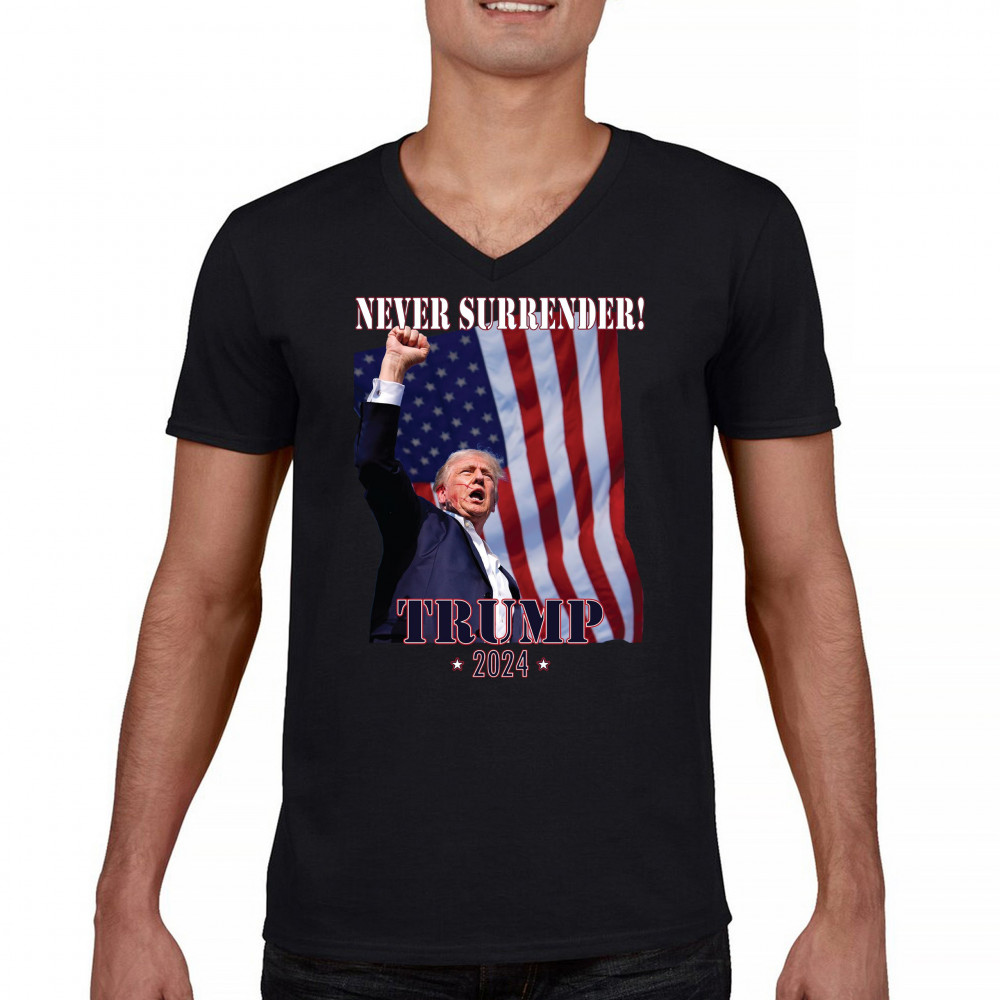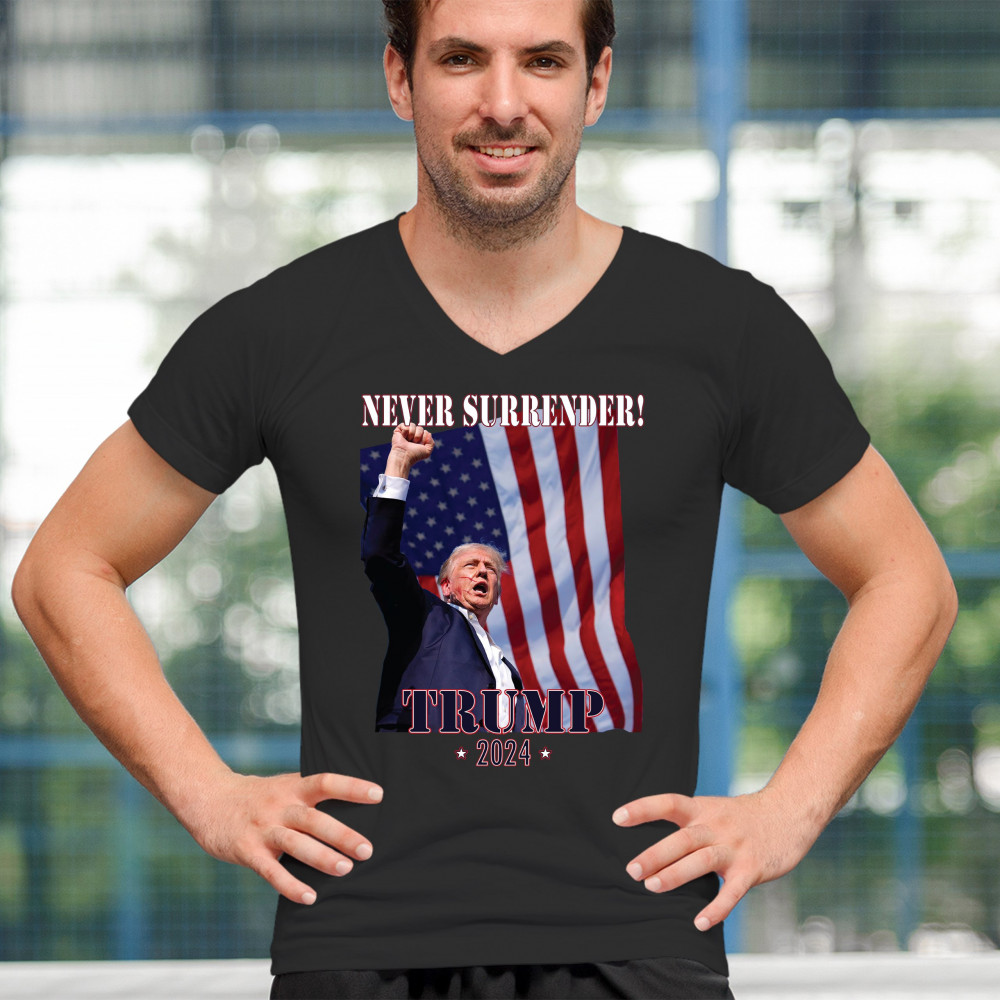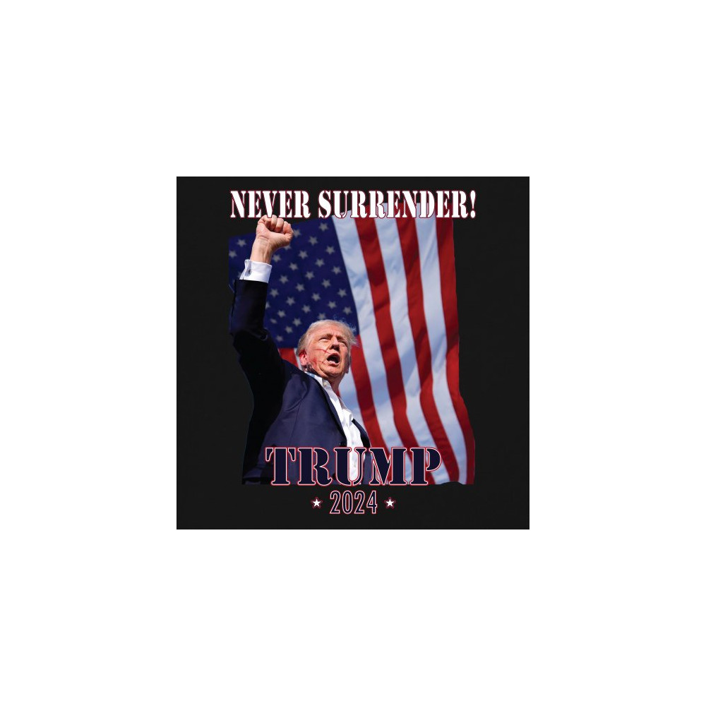 Support Donald Trump with our bold "Never Surrender! Trump 2024" design, featuring Trump against the American flag. Perfect for rallies and everyday wear.