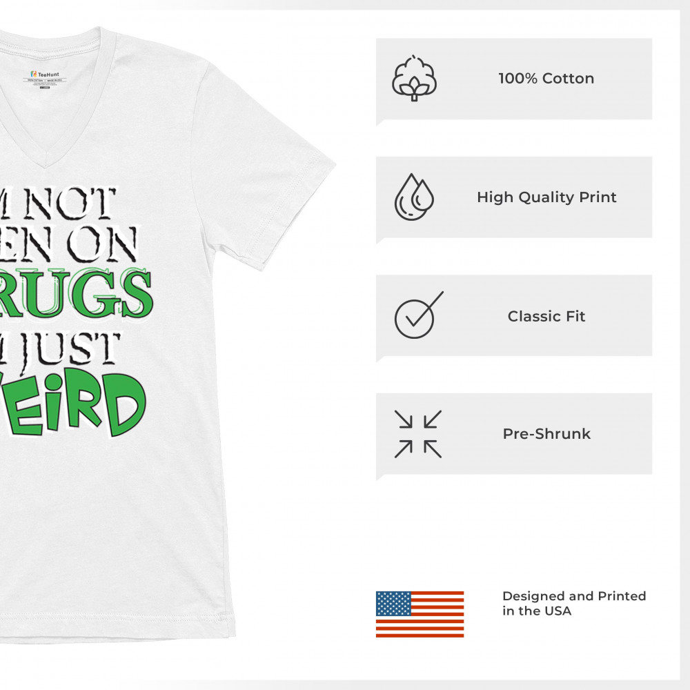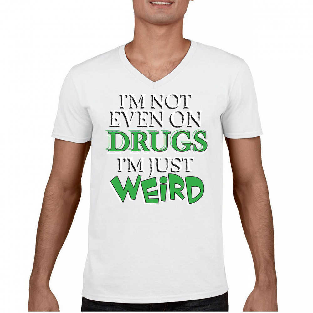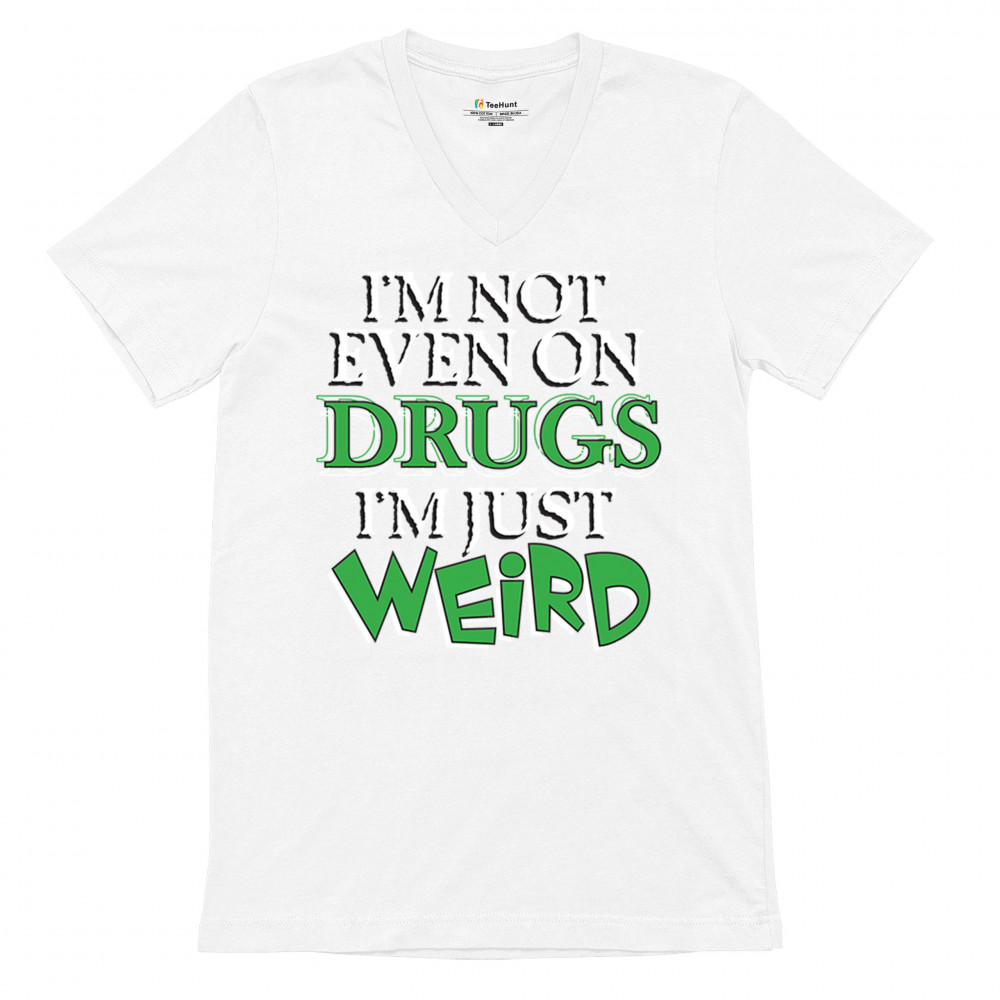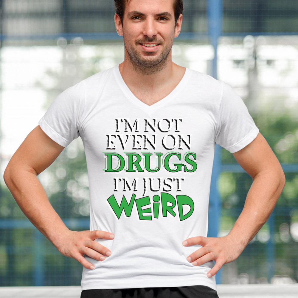 Bold weird design for introverts and quirky minds. Says “I'm not even on drugs I'm just weirdâ€â€”perfect for awkward humor and loud energy.