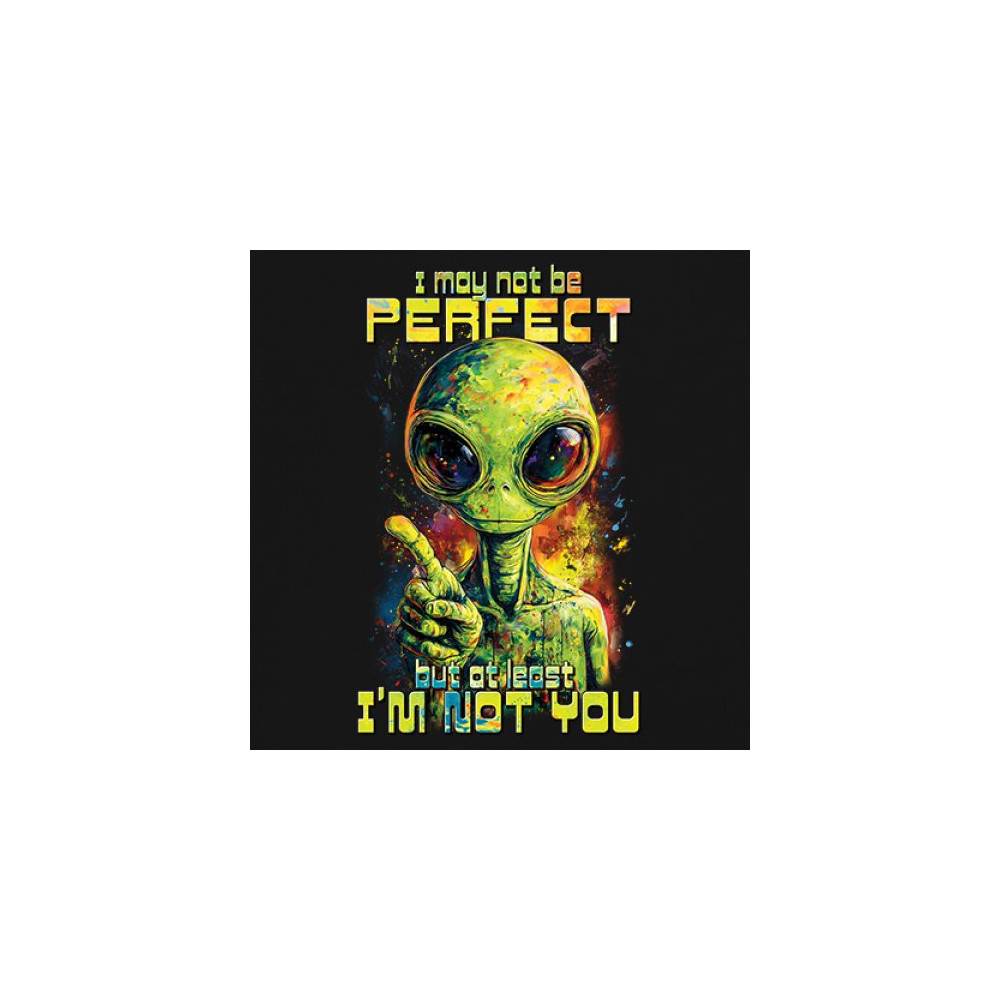 This smug alien design delivers sharp sarcastic humor with vibrant cosmic flair. Featuring a big-eyed extraterrestrial and the quote “I may not be perfect, but at least I’m not you,” it’s perfect for sci-fi fans, alien lovers, jokesters, and oddballs alike. A bold, funny statement for parties, UFO events, and festivals.