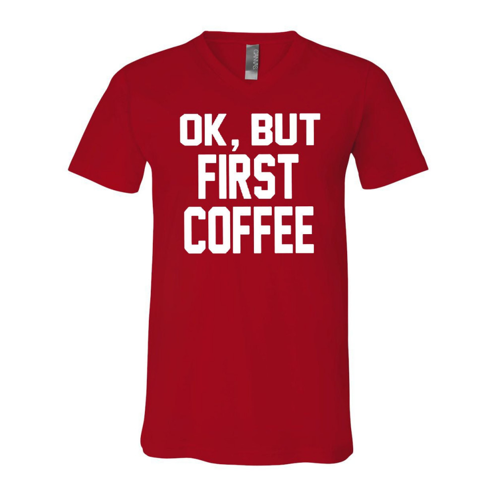 OK, BUT FIRST COFFEE v-neck t-shirt coffee drinker tee red