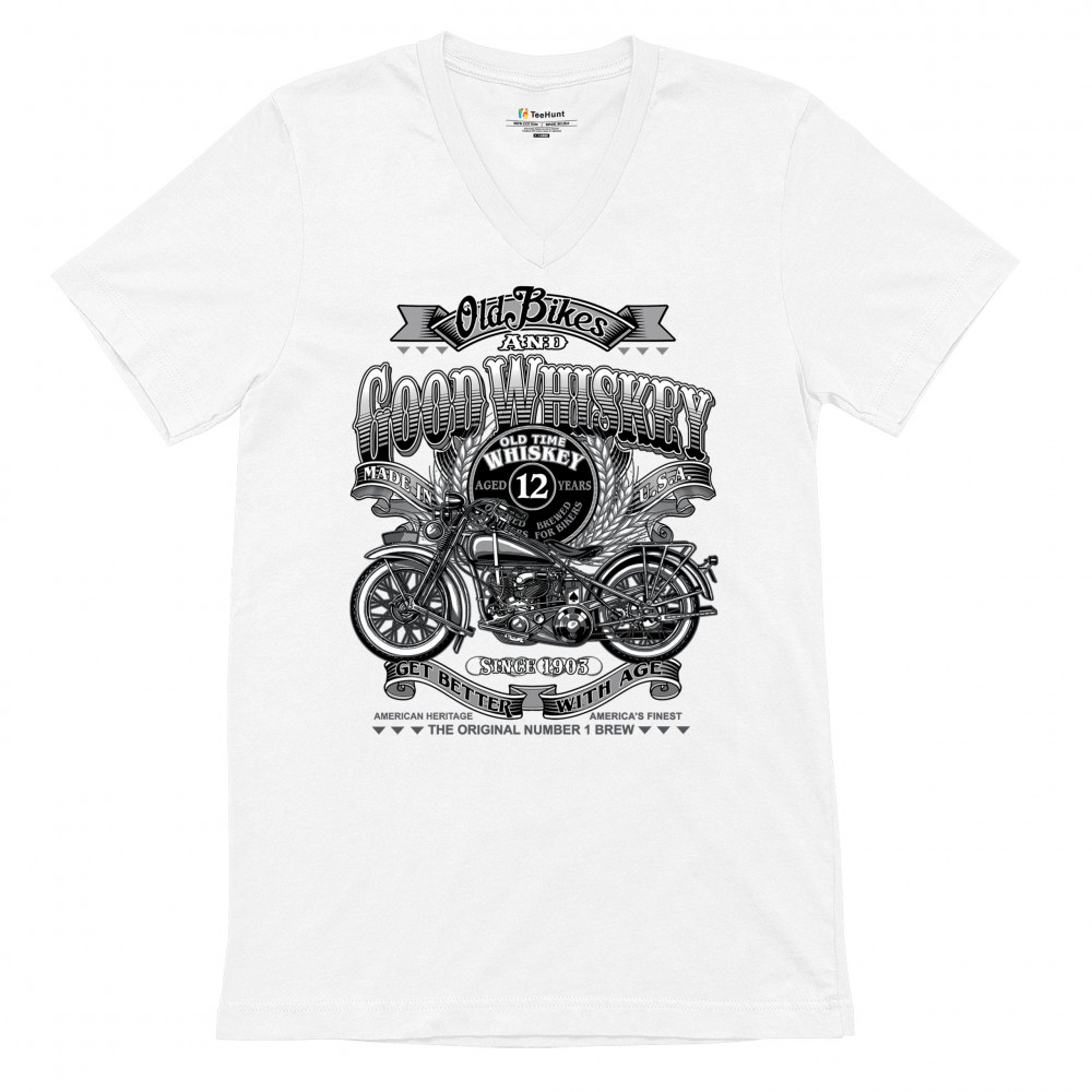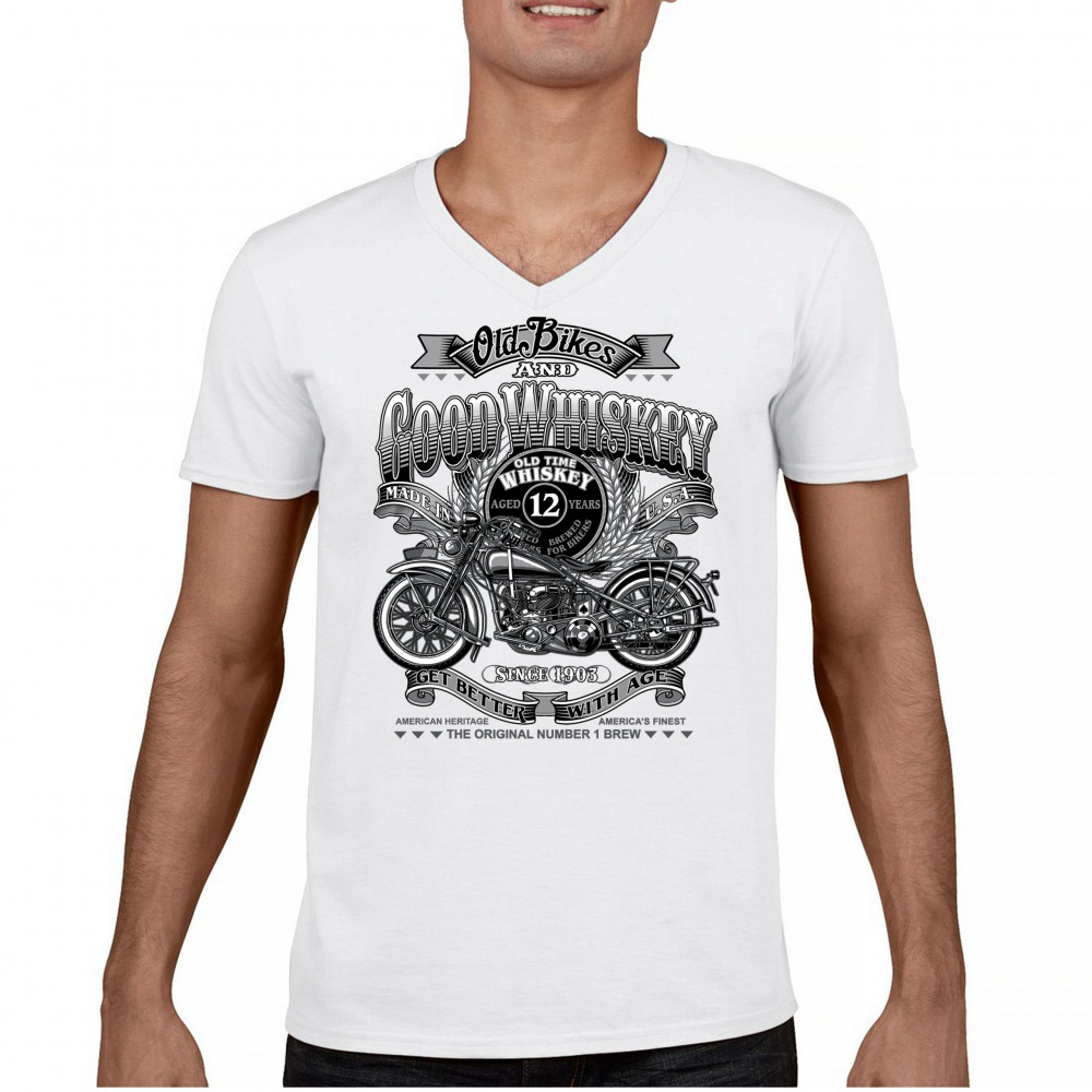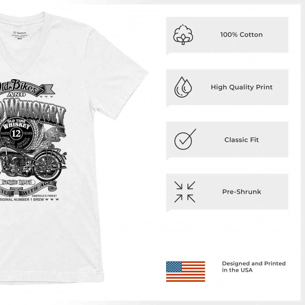 Vintage design with old bike, 12-year whiskey label, and 1903 tribute—perfect for bikers who ride hard and sip slow.