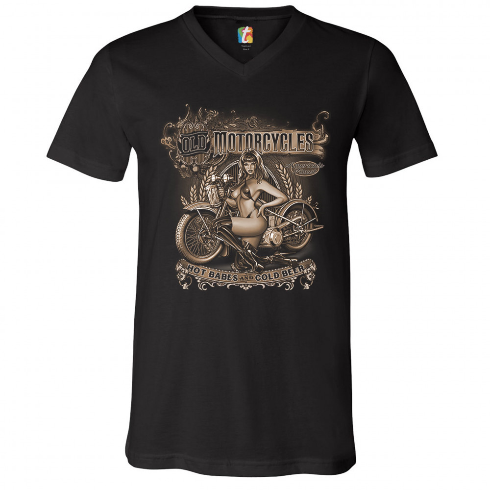 OLD MOTORCYCLES HOT BABES AND COLD BEER v-neck t-shirt biker babe chopper tee black