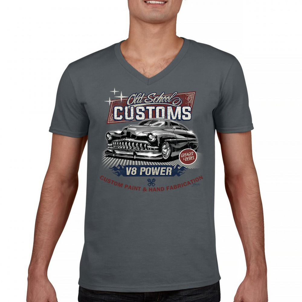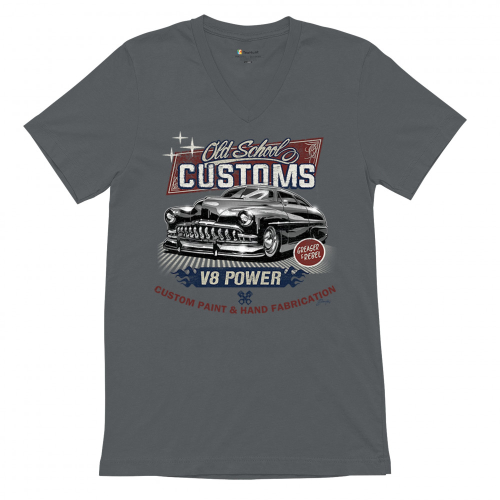 Celebrate classic automotive culture with our "Old School Customs" t-shirt, featuring a V8 power design. Perfect for car enthusiasts and fans of vintage rides.
