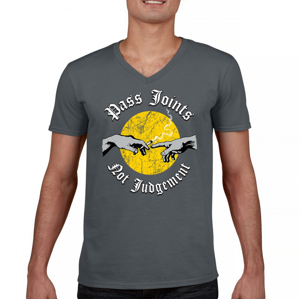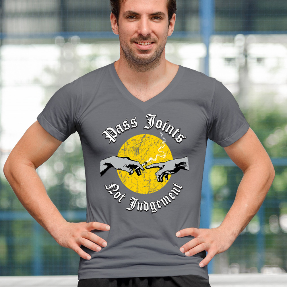 Cannabis culture twist on classic art. Hands passing a joint with “Pass Joints Not Judgement†message. Chill, bold, and unapologetically stoner.