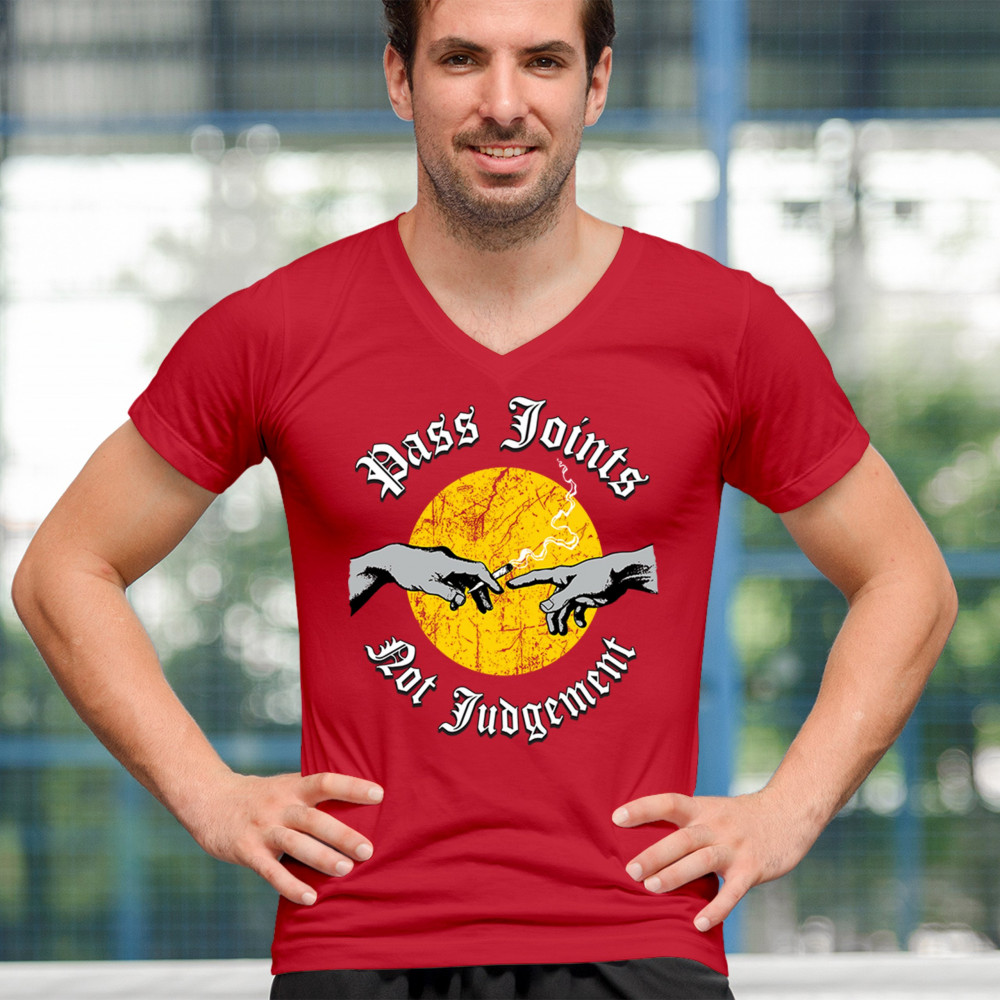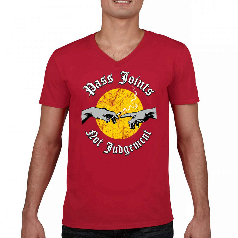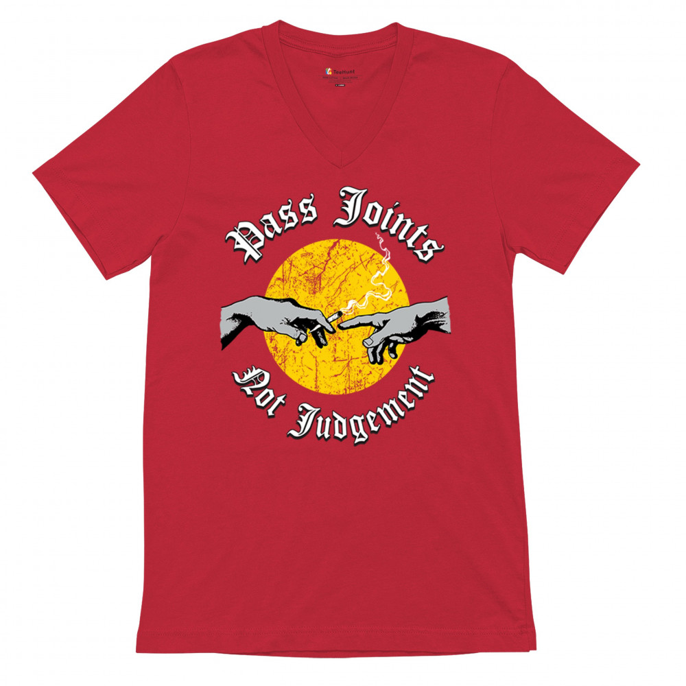 Cannabis culture twist on classic art. Hands passing a joint with “Pass Joints Not Judgement†message. Chill, bold, and unapologetically stoner.