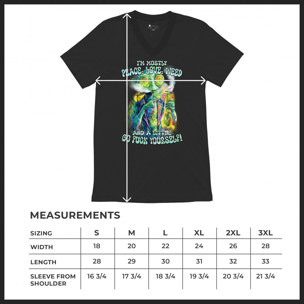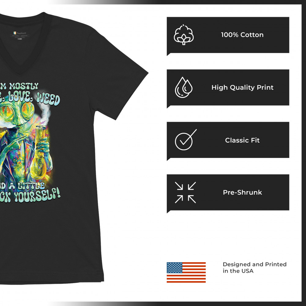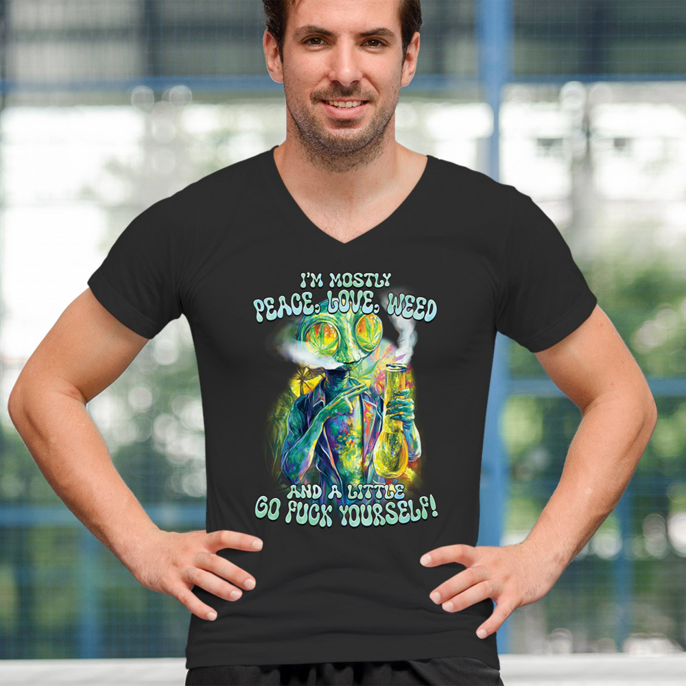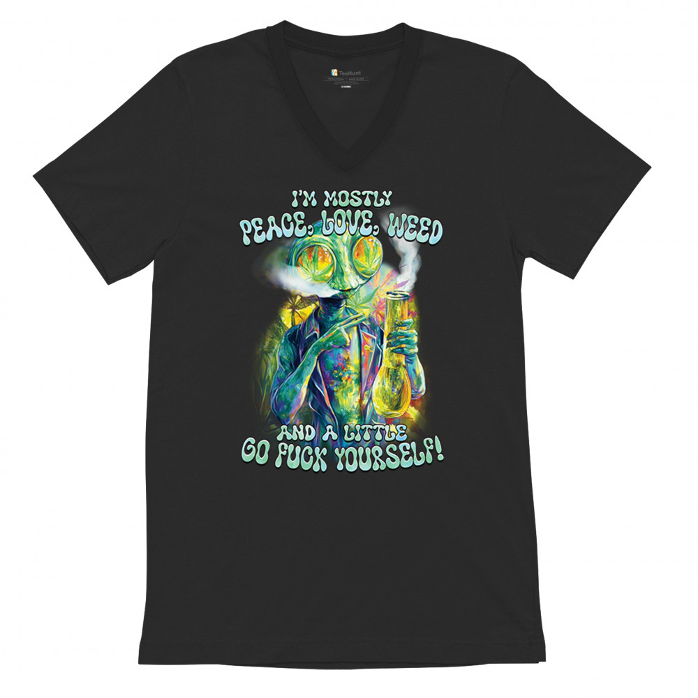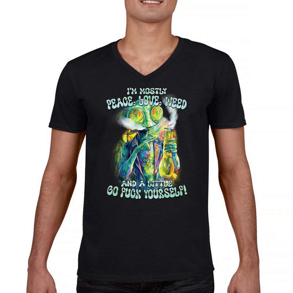 PEACE LOVE WEED men's v-neck t-shirt sarcastic 420 leaf pothead alien ufo day black